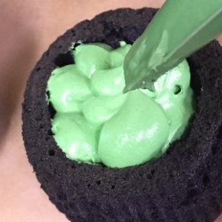 - Fill cupcake hollow with green frosting and swirl around, creating a two-toned look.