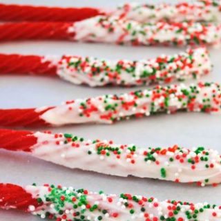 - Dip licorice wands about halfway into melted chocolate. Set down on parchment-lined plate. Sprinkle with desired garnish