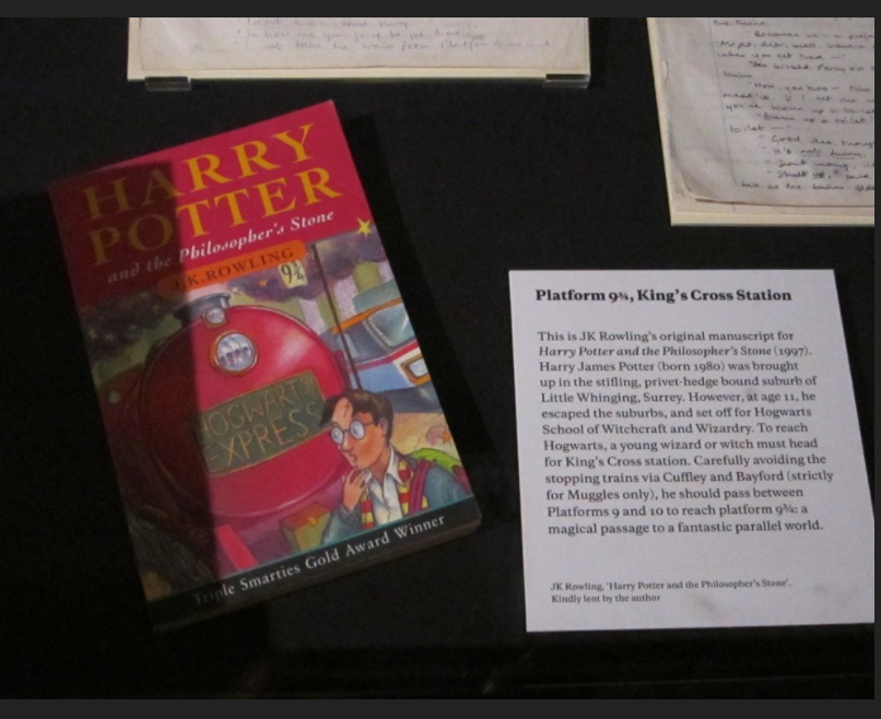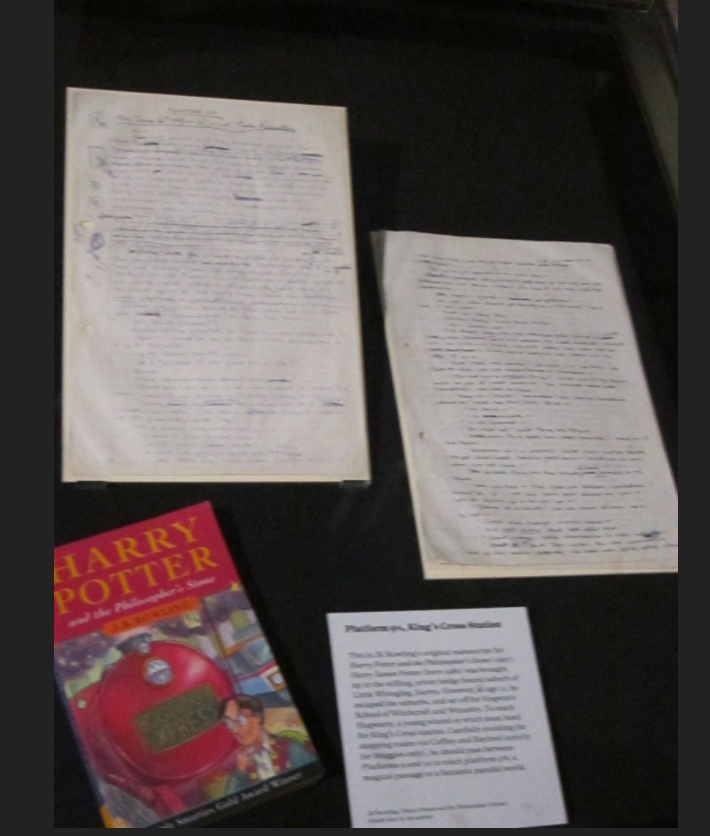 As a Potter fan, upon hearing that the manuscript for Harry Potter and the Philosopher’s Stone was on display in the British Library (a convenient ten-minute walk from my dorm), I promptly made my way there first thing this afternoon. The exhibition cost £5 and was surprisingly empty. It was called Writing Britain and is about depictions of Britain in British literature, with Harry Potter representing King’s Cross in London.