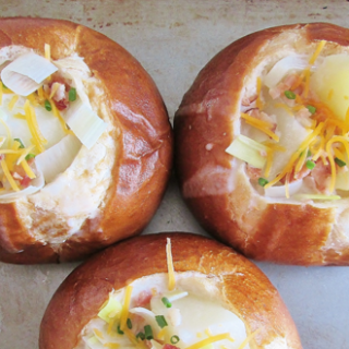 Alison WalshThis recipe enhances the taste of simple leek soup with the addition of potatoes, bacon, chicken, and cream. Even more creatively, it's served in pretzel bun bowls garnished with chives.