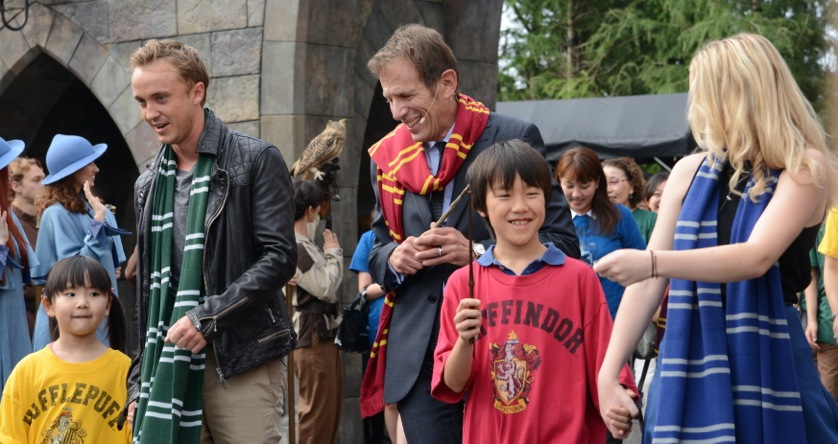 A small stage was set up on the left side of the entrance gate to Hogsmeade and the first person to come up to give a speech was the president of USJ, Mr. Glenn Gumpel. Next came Evanna Lynch who portrayed Luna Lovegood and Tom Felton who portrayed Draco Malfoy in the Harry Potter movies. After a short speech by Evanna and Tom, the three took their wands out and got ready for the big reveal. They pointed their wands up and at the count of three they shouted, “Revelio!” massive cloud of white smoke erupted out of nowhere and filled the air, hiding the entrance to Hogsmeade. As the smoke dissolved, we were greeted by characters from the Harry Potter world (Hogwarts, Beauxbatons and Durmstrang students in their uniforms, the Hogwarts Express conductor and more).