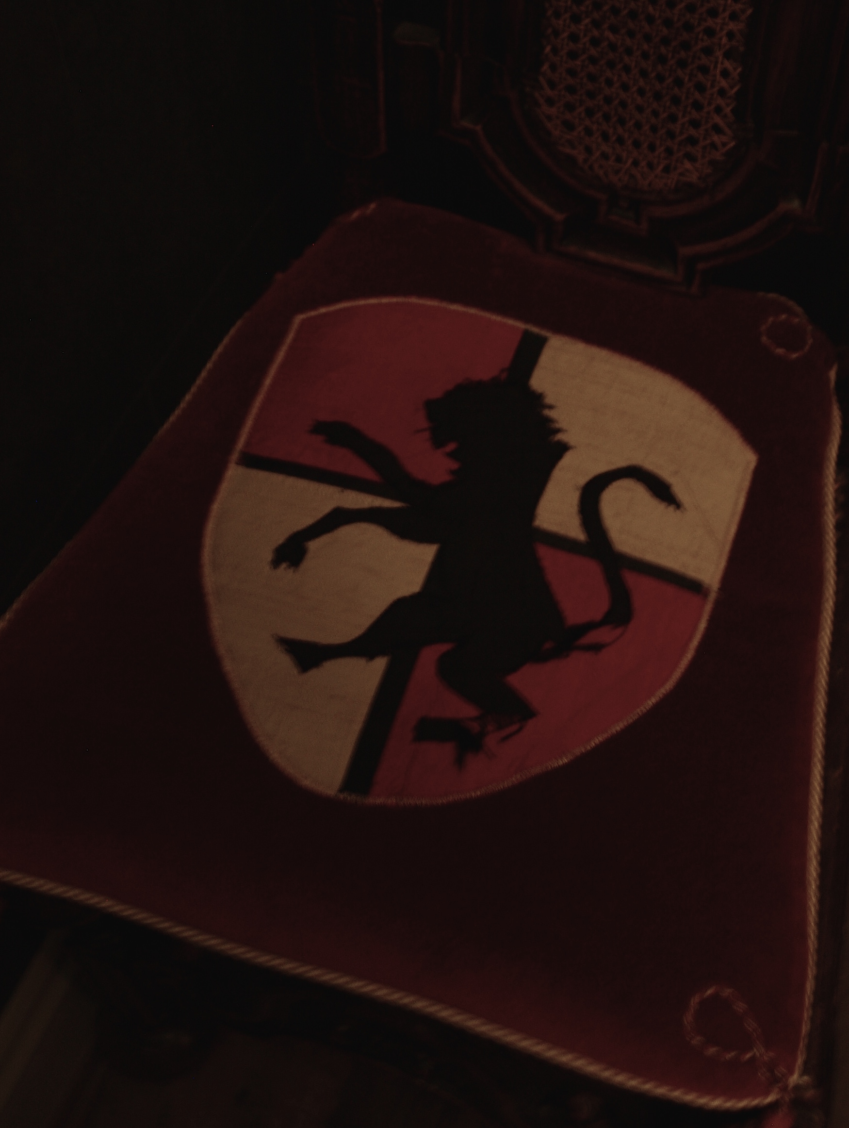 Candles light your path down the stairs into the small hallway while two chairs at the end are adorned with lion emblem cushions. The walls are lined with assorted artwork, and bottles of all sizes sit on shelving just short of the ceiling.