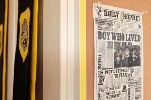 Adrian made banners for the wardrobe with some plain felt and iron-on patches and crafted a door for the bookcase with the same theme. They even set up a “password picture” on the outside of the bedroom door in a similar fashion to the way it looks on Pottermore!