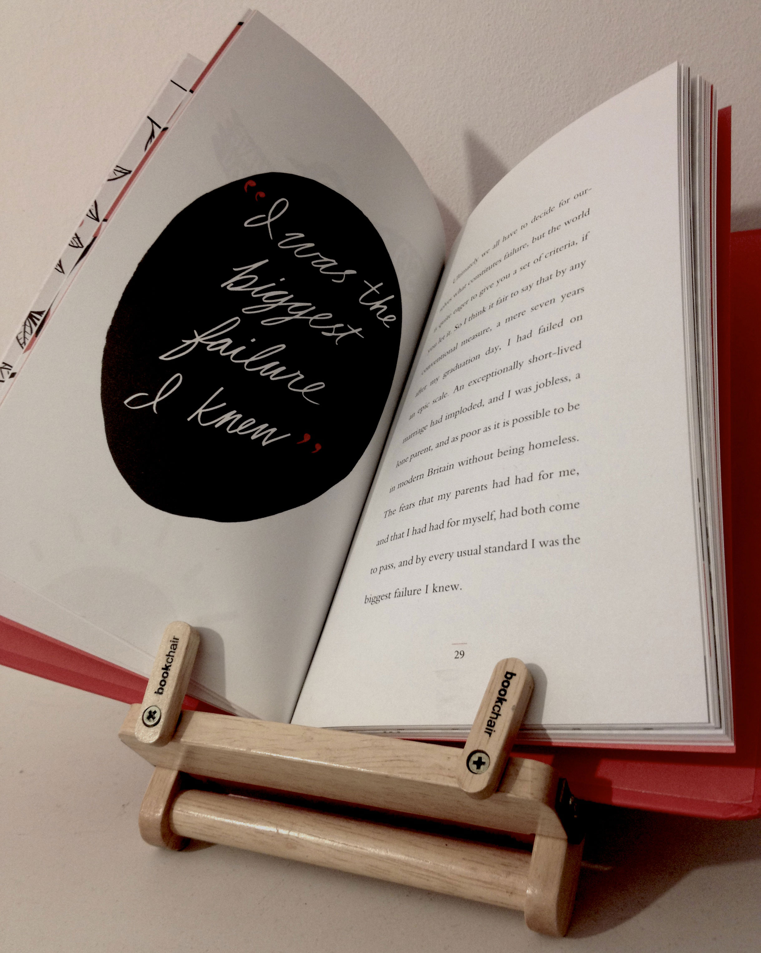 Designed by Joel Holland, the illustrations are simple but elegant, maintaining a bold color pallet of red, black, and white. Largely single objects, these images usually remain on just one page while the text is laid out on the other. Occasionally, the images burst from these boundaries and flow across the page, such as a sprawling bookcase or birds fleeing a cage. The latter imagery is part of a number of evocative images that, on an initial thumb through, lept from the pages. Odd flourishes of typography pull notable quotes from the text: “I was the biggest failure I knew.” “A scream of pain and horror” and once, sat alone in the bottom left hand corner of a page, “humility.” The color images on black allow for a strong contract with the front cover – an array of black graduation caps on red.