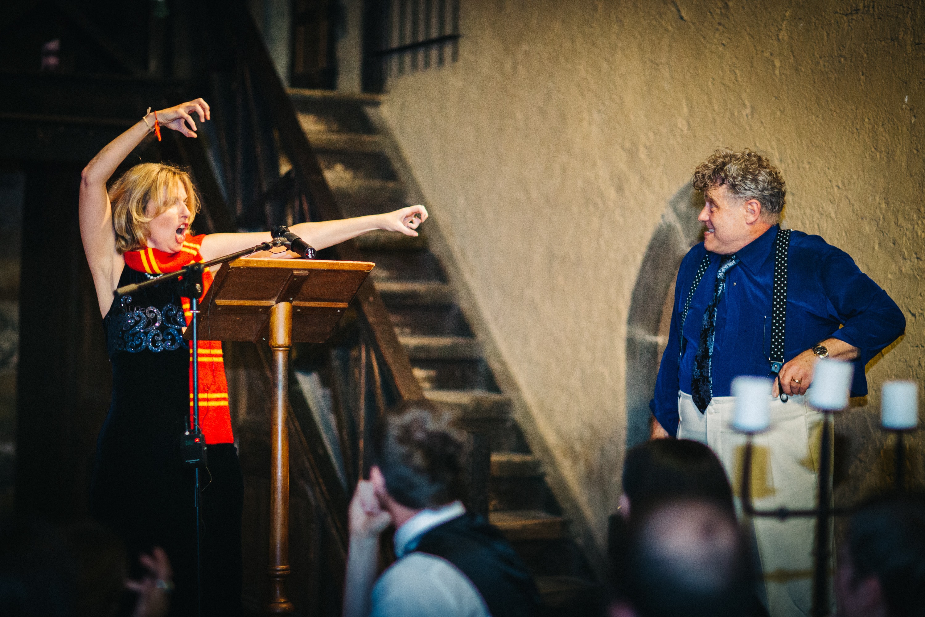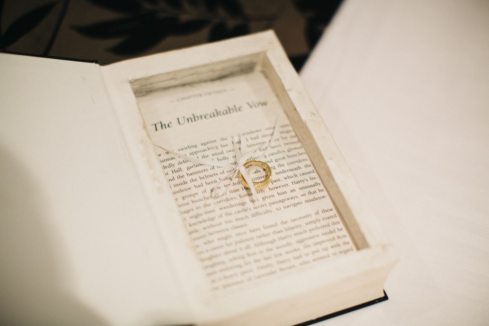 Their ring box comprised that very romantic image you have surely seen around social media – The Half Blood Prince cut open to the Unbreakable Vow chapter. And while it would have been great to have Fred and George emcee their reception, two of their well-versed relatives readily stepped in and provided the evening’s entertainment. Harry Potter, Doctor Who, Jane Austen, Firefly, and even Game of Thrones found their way into lively duels, heartwarming dialogues, and grand performances. As Michaela pointed out,