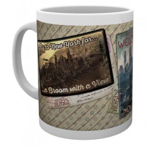 First, I opened two boxes of roughly the same size. Each box contained a heavy coffee mug, both decorated with images or words from the Fantastic Beasts film. The first, a white mug with what I’ll call an ’80s feel, had the word “No-Maj” on it. The second mug had a number of postcards decorating the white ceramic, all fashioned from the Fantastic Beasts film time period of the late ’20s in New York. The postcards beckon the drinker to come to New York, to experience a “broom with a view.”