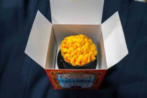 The new cauldron cake is a chocolate cake topped with bright yellow-orange buttercream icing and tucked into a reusable cauldron, all fit neatly into a square box. It’s now available at Honeydukes in Hogsmeade and Sugarplum’s Sweet Shop in Diagon Alley for $9.95, according to the Orlando Informer.