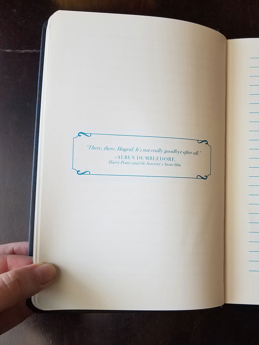 The main event, of course, is the journal itself. The Pensieve emblem on the front makes it a little bulky – I would be worried about it breaking off or scuffing if I carried it around – but I kind of like the fact that its bulkiness encourages you to use the journal as part of the kit. If you keep it stored in its lovely box and only take it out when you’re feeling ready to really think about which memories you want to record, it heightens the experience of writing. It’s almost like you are actually traveling into Dumbledore’s Pensieve! The journal also features quotes from the Potter films throughout – a fun touch to inspire your writing!