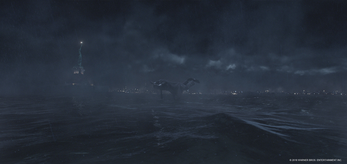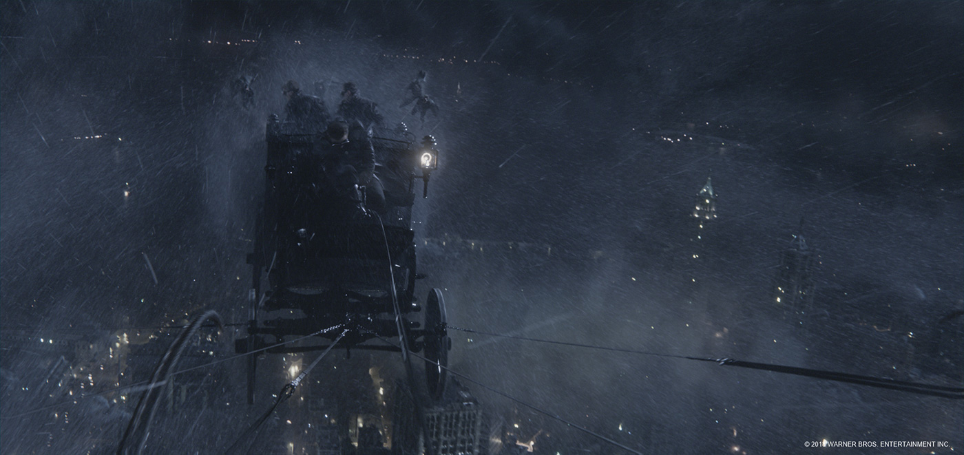 For this sequence we created a full CG 1927 period New York City from scratch. It was a huge task, as you can’t just download the modern NYC city and use that; it really had to be based around 1927 archival photos and be believable. It is set at night within a rainy, stormy, environment. We had to be able to fly around the city and see it at various levels of detail from high above to flying right by a building. It took a lot of work to build and lay out the city, to know exactly where to add the detail. Cars, trams, trucks, boats and people were all added to give movement, help with the scale, and add city life. The city itself had water dripping over the surface of buildings and running off ledges, with puddles all over the place. It really felt wet and gave a great sense of detail.