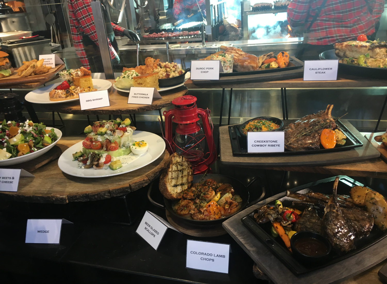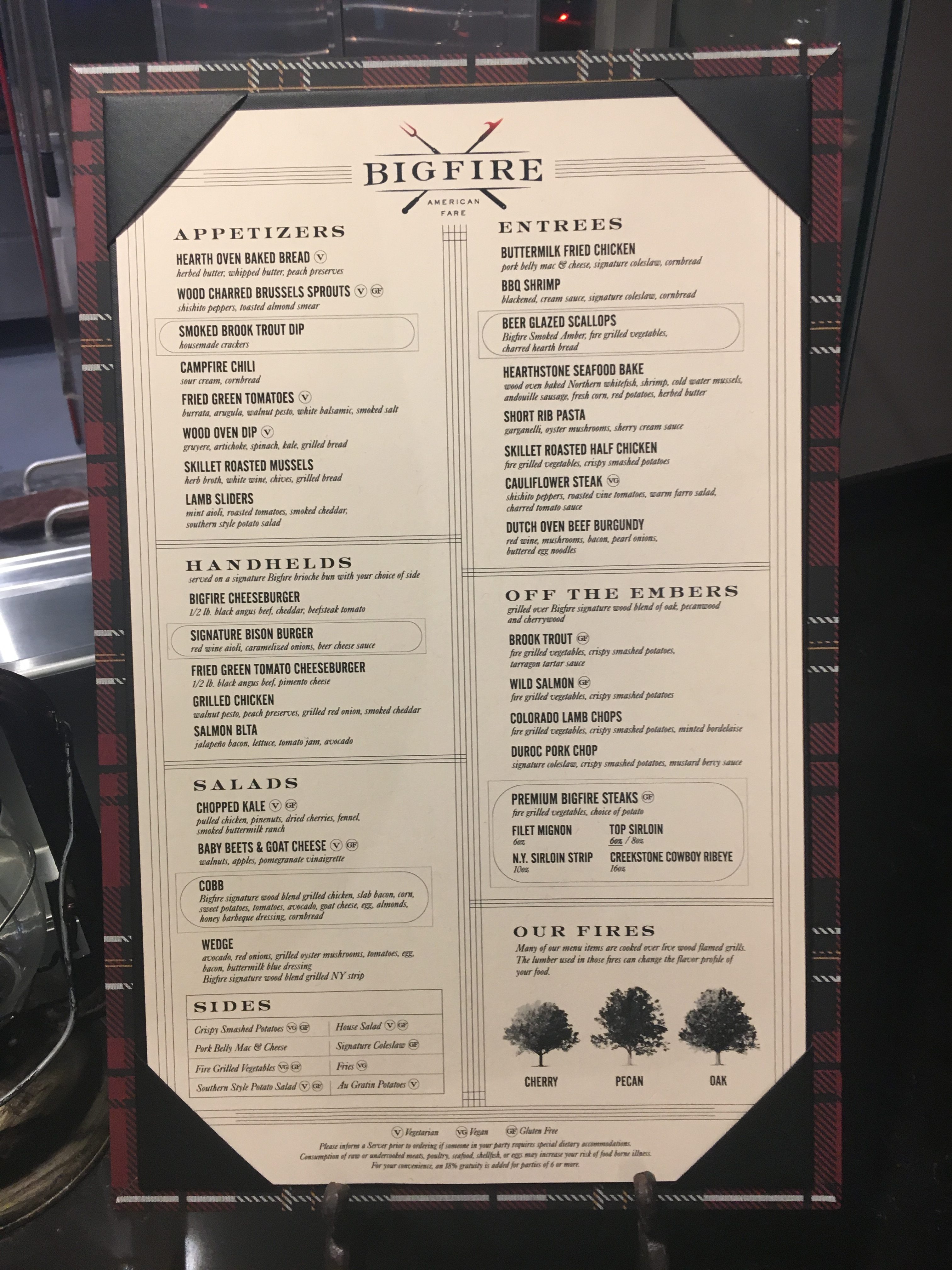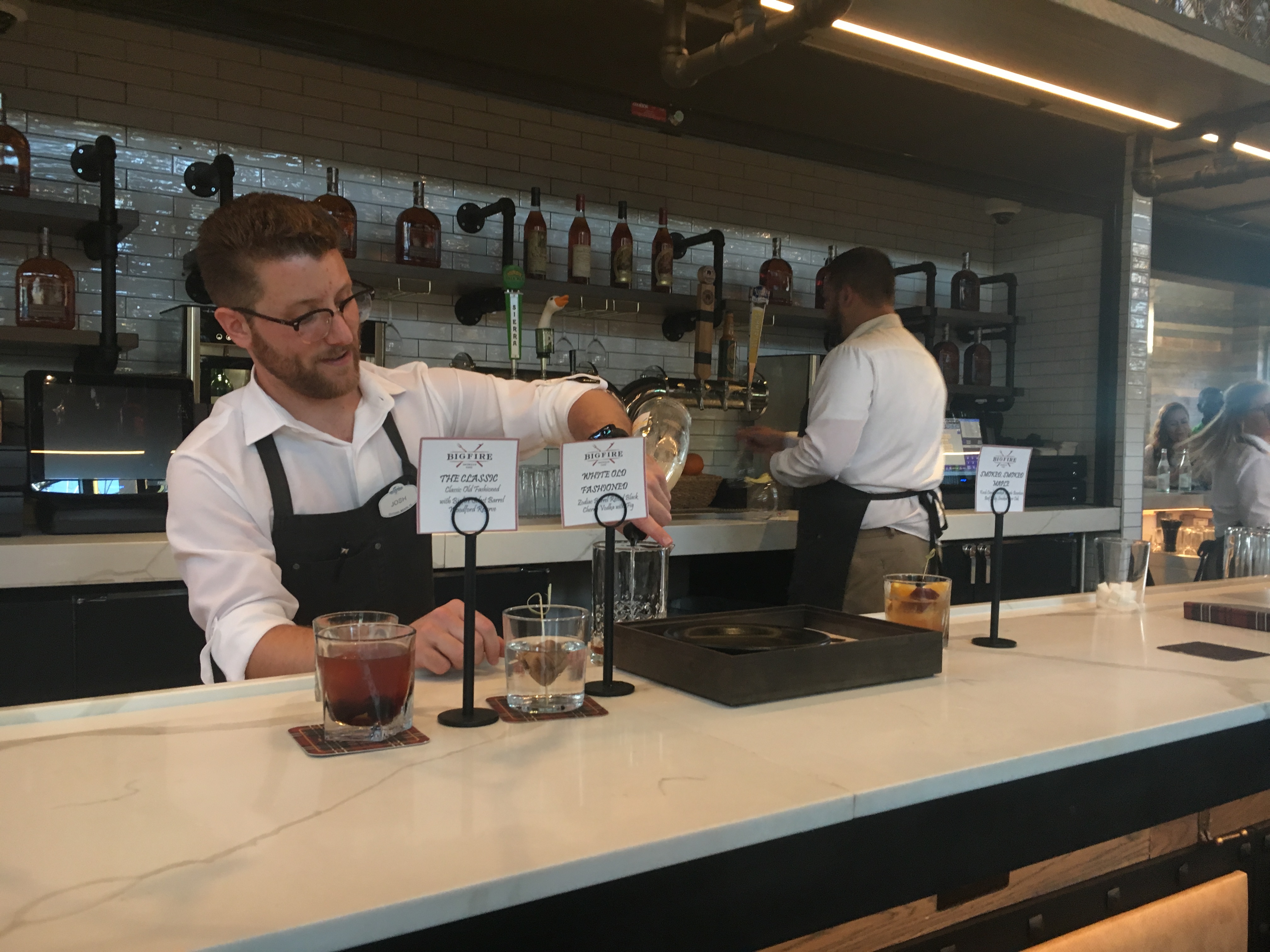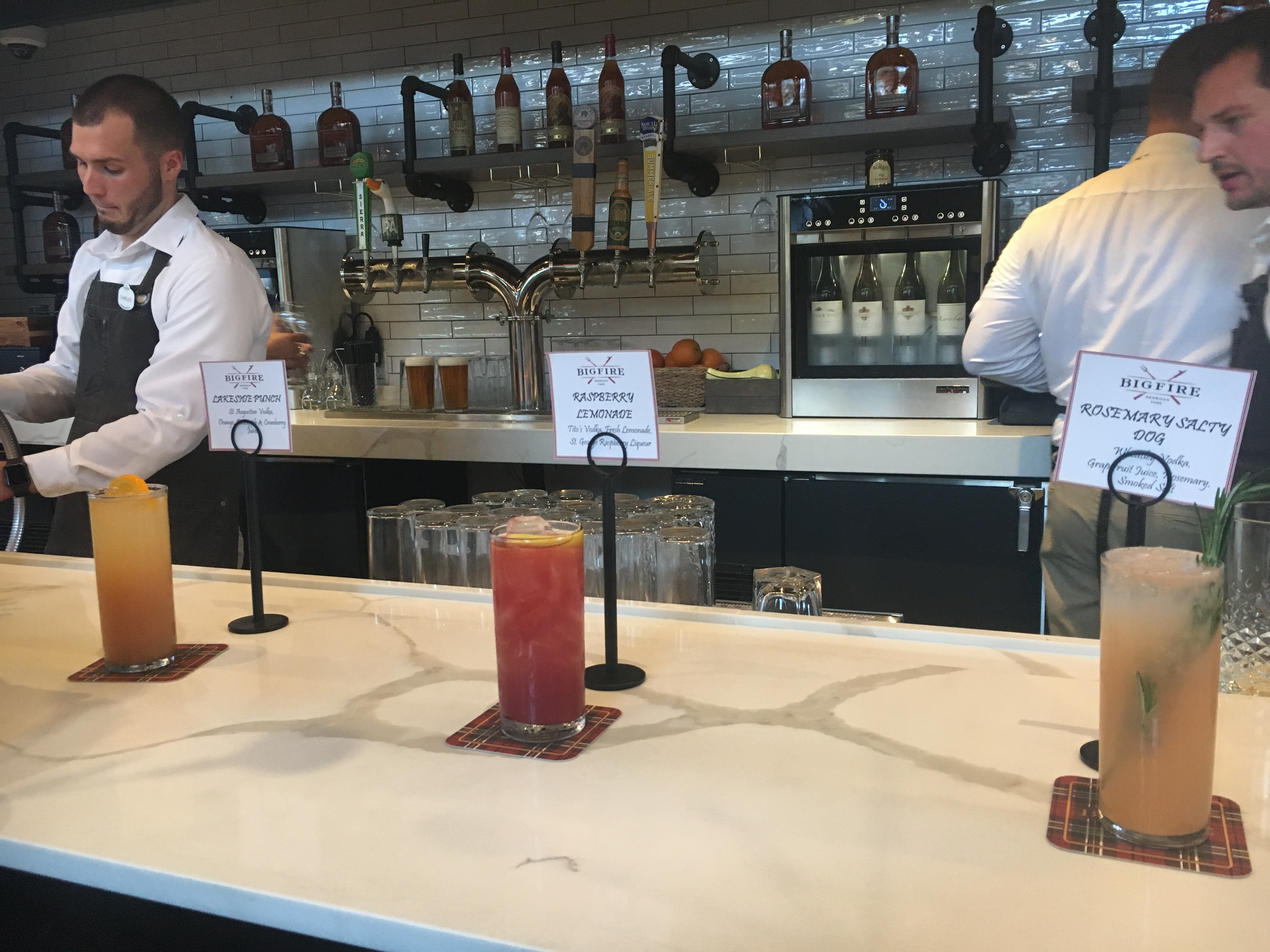 Opening this summer, Bigfire is designed to feel like a cozy lake house, where the best meals are homemade and shared among close friends and family. Bigfire, inspired by cooking over an open flame, is spread out over two levels and offers views of the surrounding CityWalk and theme parks. Each ingredient is matched with the perfect wood – cherry, pecan, or oak – to bring out the best flavors. The menu boasts a variety of American dishes, from burgers to seafood, steaks to salads, and cocktails to desserts, and includes vegetarian, vegan, and gluten-free options. The bar-style seating against the windows had alternating bag hooks and USB/standard outlets for every seat, ensuring that guests can stay comfortable and take time to recharge.