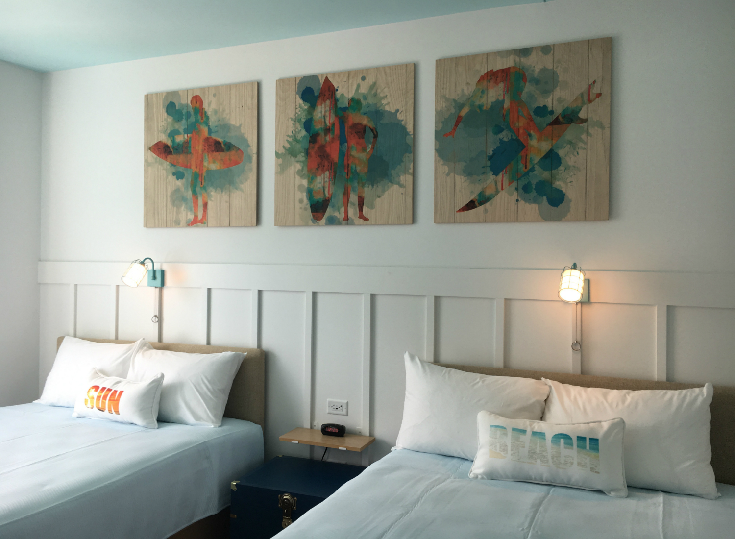 A tropical color scheme of turquoise, orange, and white continues throughout the hotel, complemented by a surfboard-shaped pool, hibiscus and wave patterns, and other designs that remind you that you’re here to chill out. Standard rooms contain two queen beds, while suites, which make up over half of the hotel’s 750 rooms, also have a kitchenette with a dining area and a second queen bedroom, sleeping up to six people total. Surfside Inn & Suites is available to book beginning June 27 and will be joined by Dockside Inn & Suites in March 2020 to form Universal’s Endless Summer Resort.