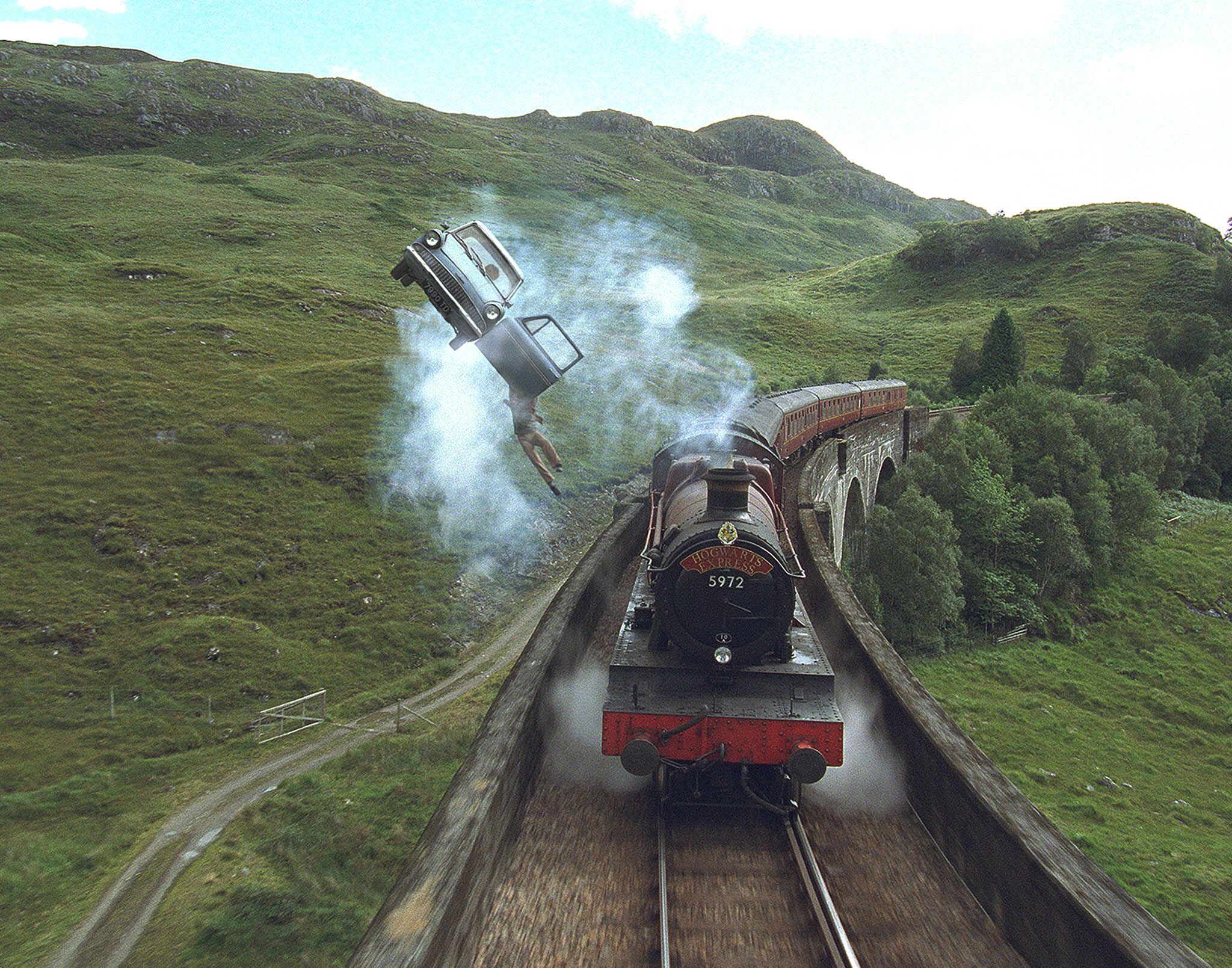 2. Harry and Ron catch up to the Hogwarts Express in the Weasleys’ flying Ford Anglia.