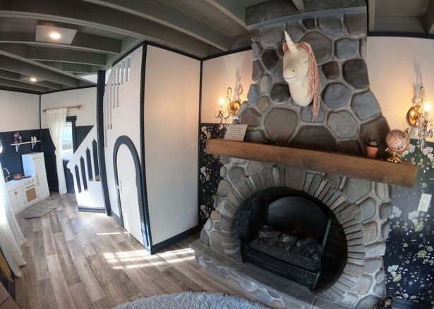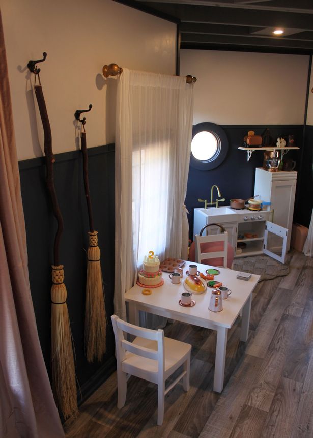 Inside the Potter house, the Dunlops’ grandchildren have access to a specially designed “cupboard under the stairs,” an electric fireplace, a Hogwarts snow globe, a Fantastic Beasts-inspired trunk drawer, and more, not to mention the framed Hogwarts acceptance letter that hangs over the playhouse’s stairwell.