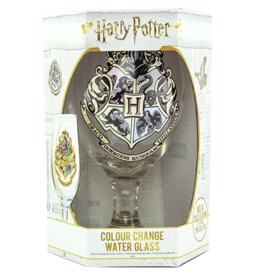 The Hogwarts crest on this water glass fills with color when cold liquid is poured into the glass.The Hogwarts crest on this water glass fills with color when cold liquid is poured into the glass.