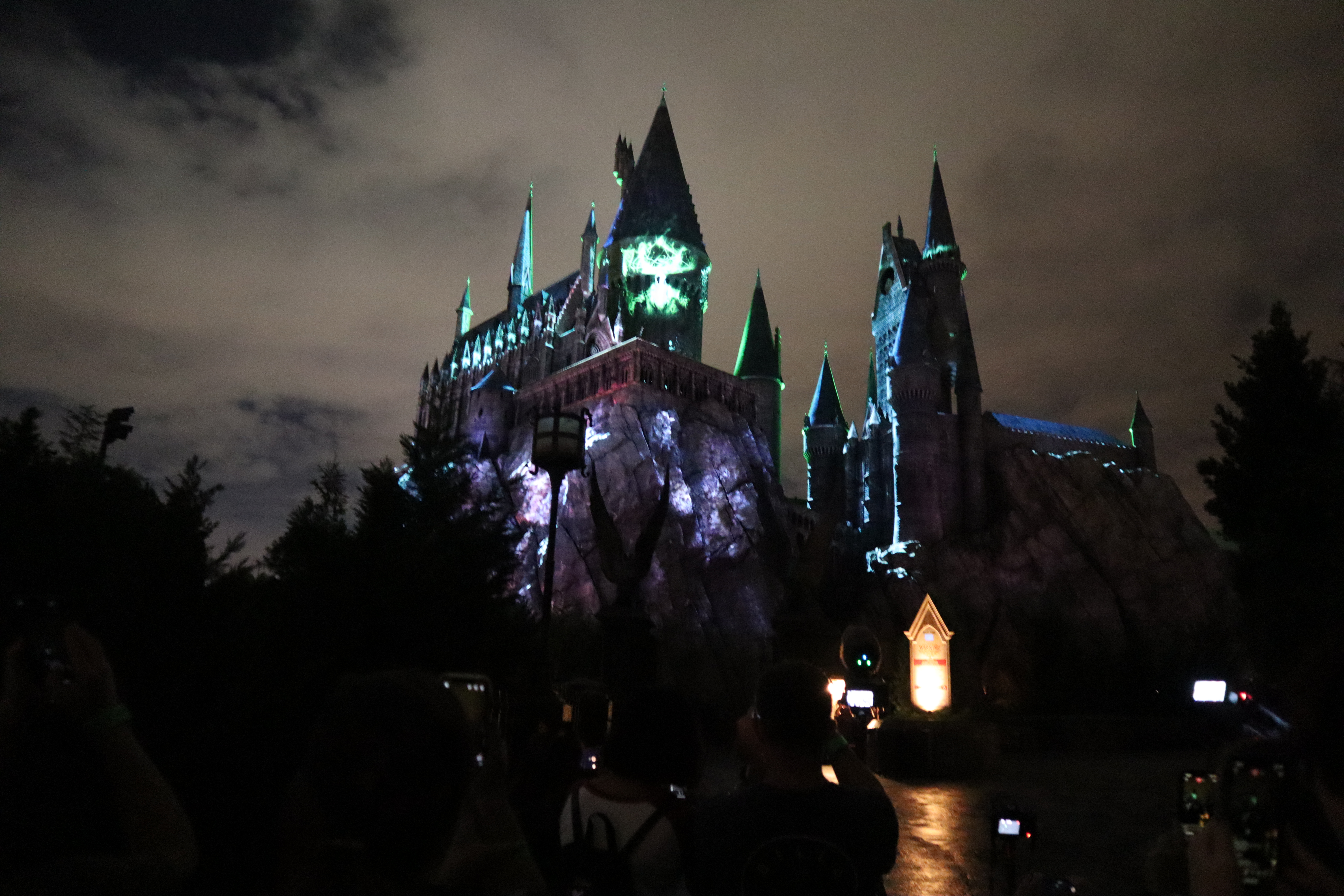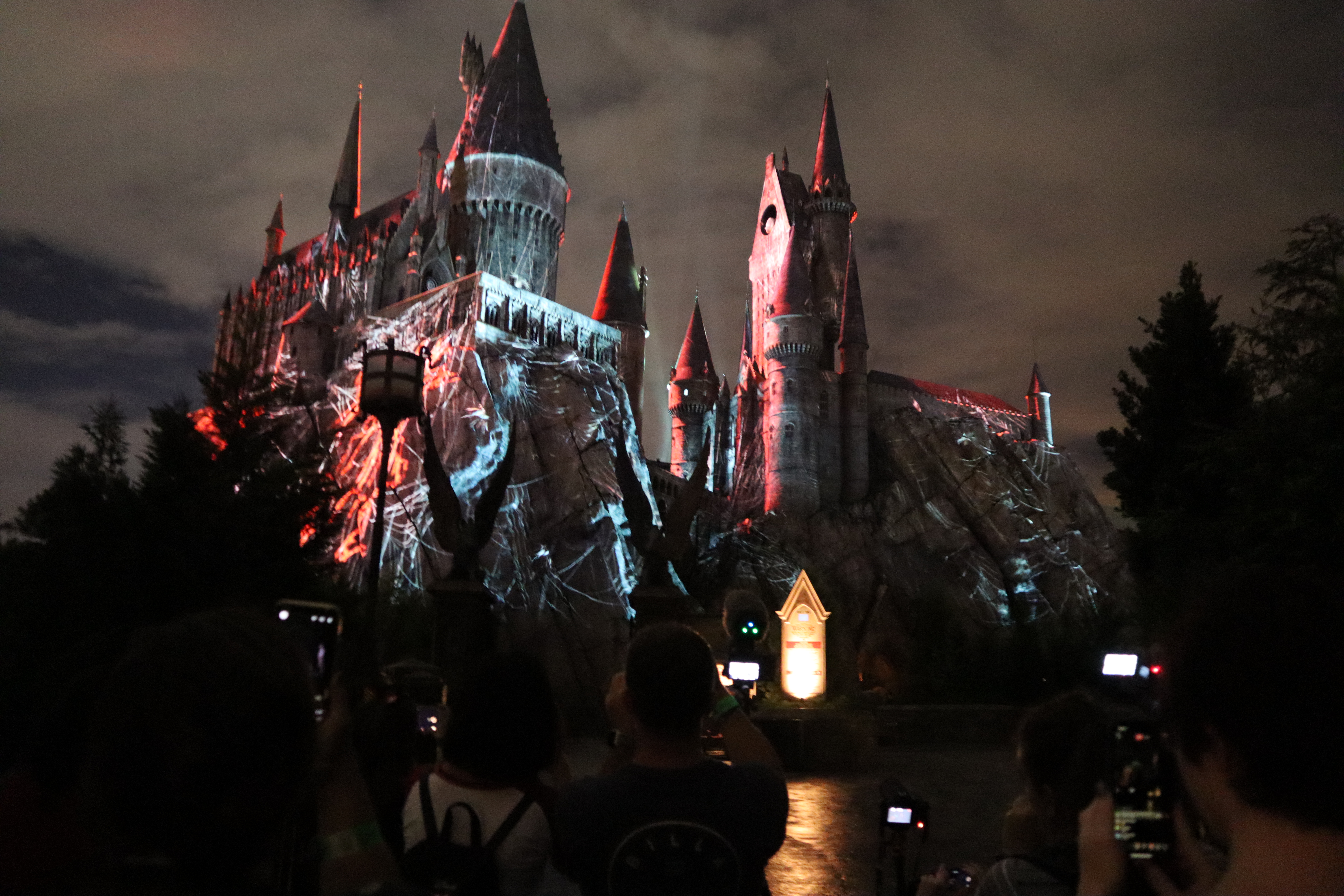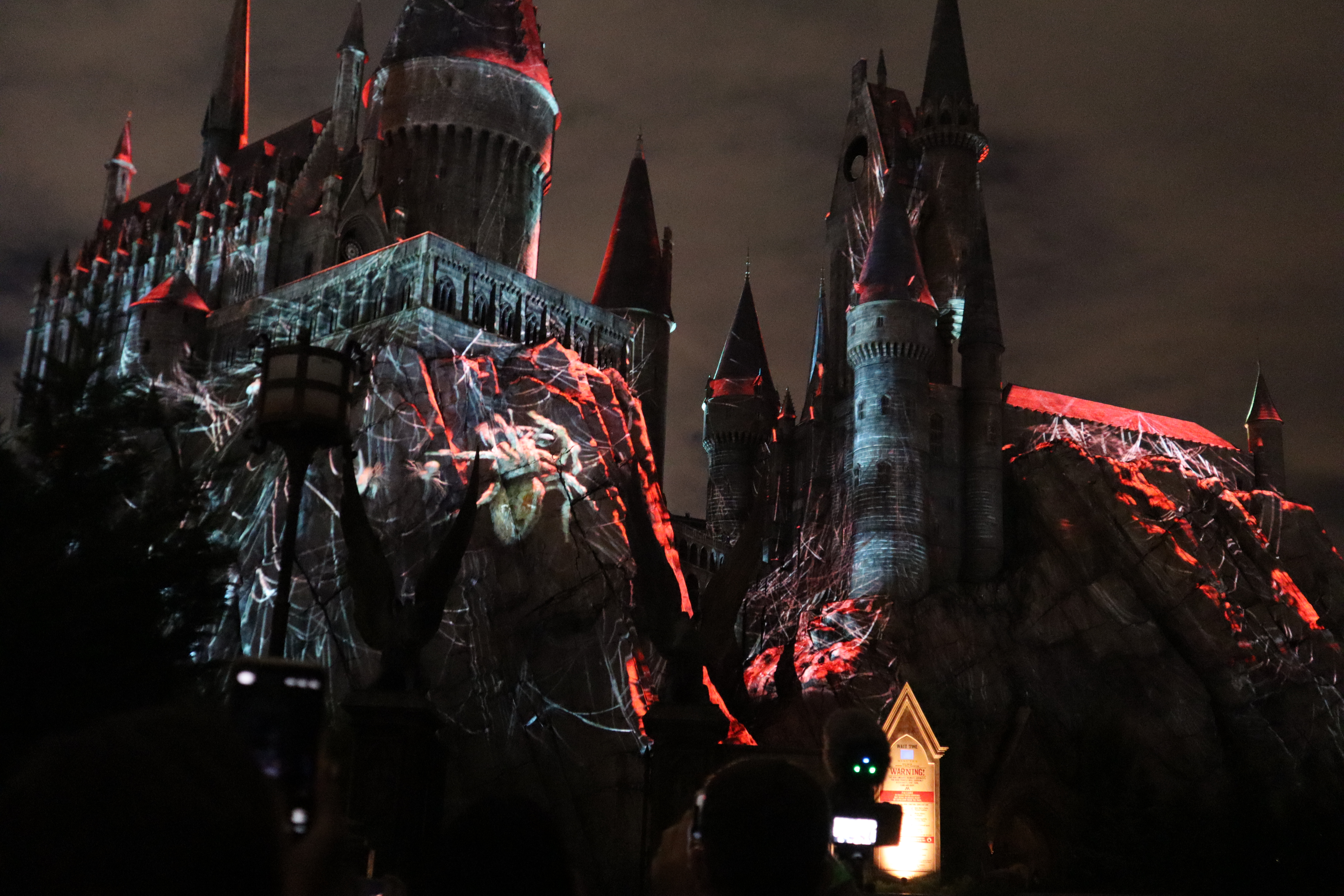 The projection show is approximately ten minutes of breathtaking visual effects accompanied by pyrotechnics and hauntingly beautiful music from the movies. The show features the most mysterious of all magic, the Dark Arts. The lights dimmed, and Parseltongue was whispered across all the speakers around us. Attendees stood frozen to the spot. The show started, and each scene was more frightening and enrapturing than the next. It began with the castle transforming to the dark storefront of Borgin and Burkes and featuring the creepy stacked skulls. Hagrid would be pleased, and possibly even a little concerned, to see the Acromantulas crawling up the castle walls (this part even featured what looked to be a human body “snack” for the spiders). We were definitely not prepared for the fiery waves of Inferi to overtake the castle right before Voldemort himself took the scene and the walls of Hogwarts came “crashing” to the ground.