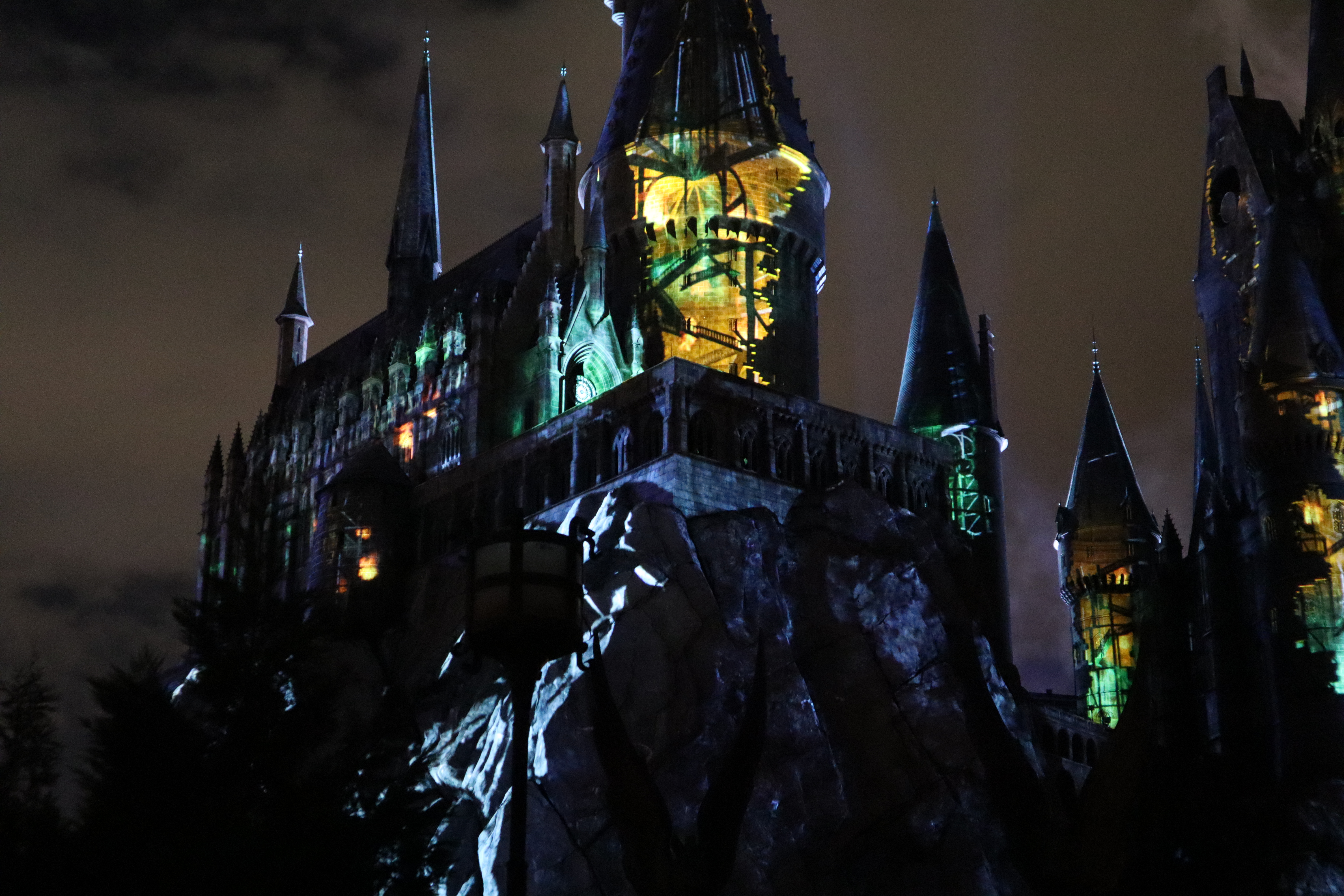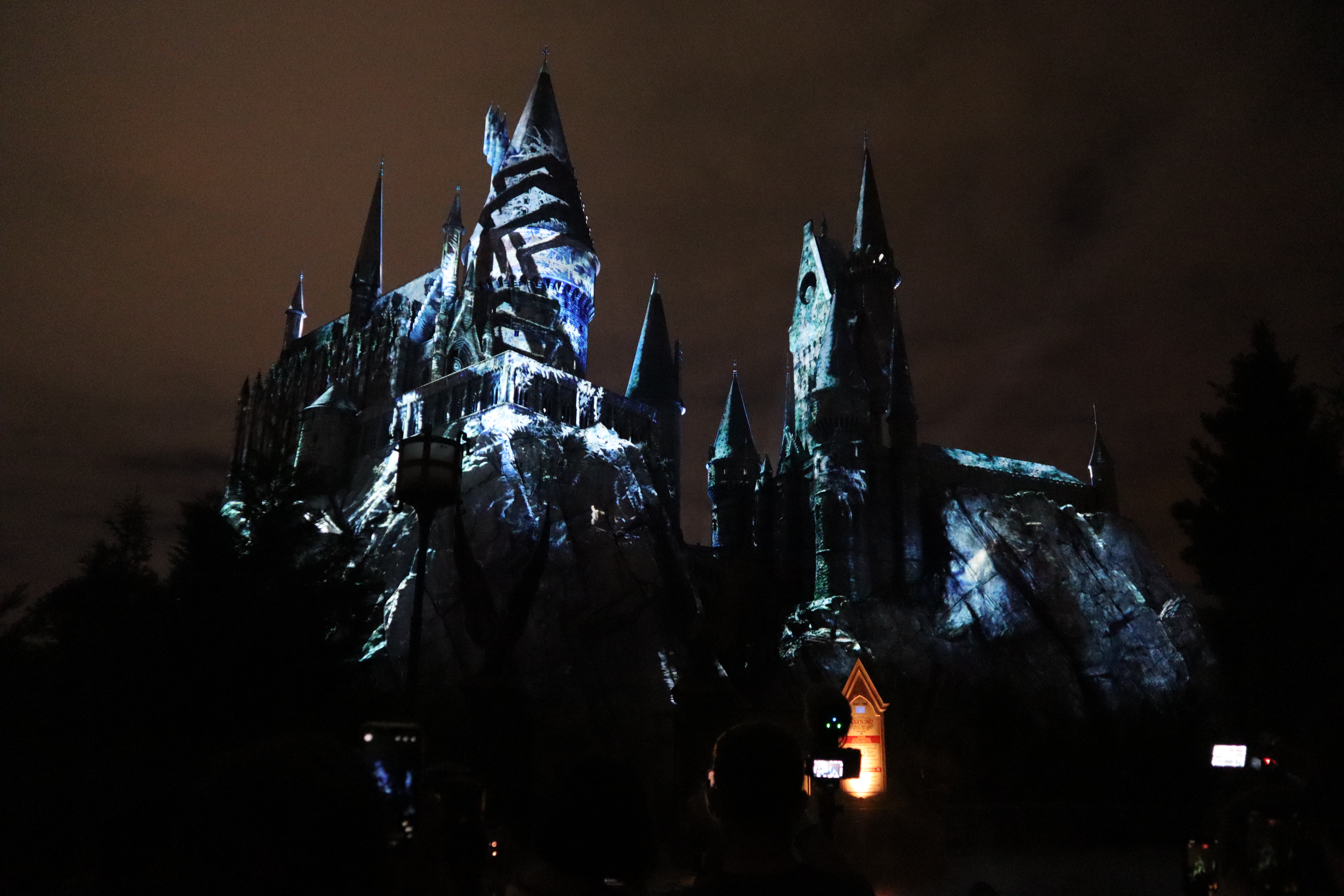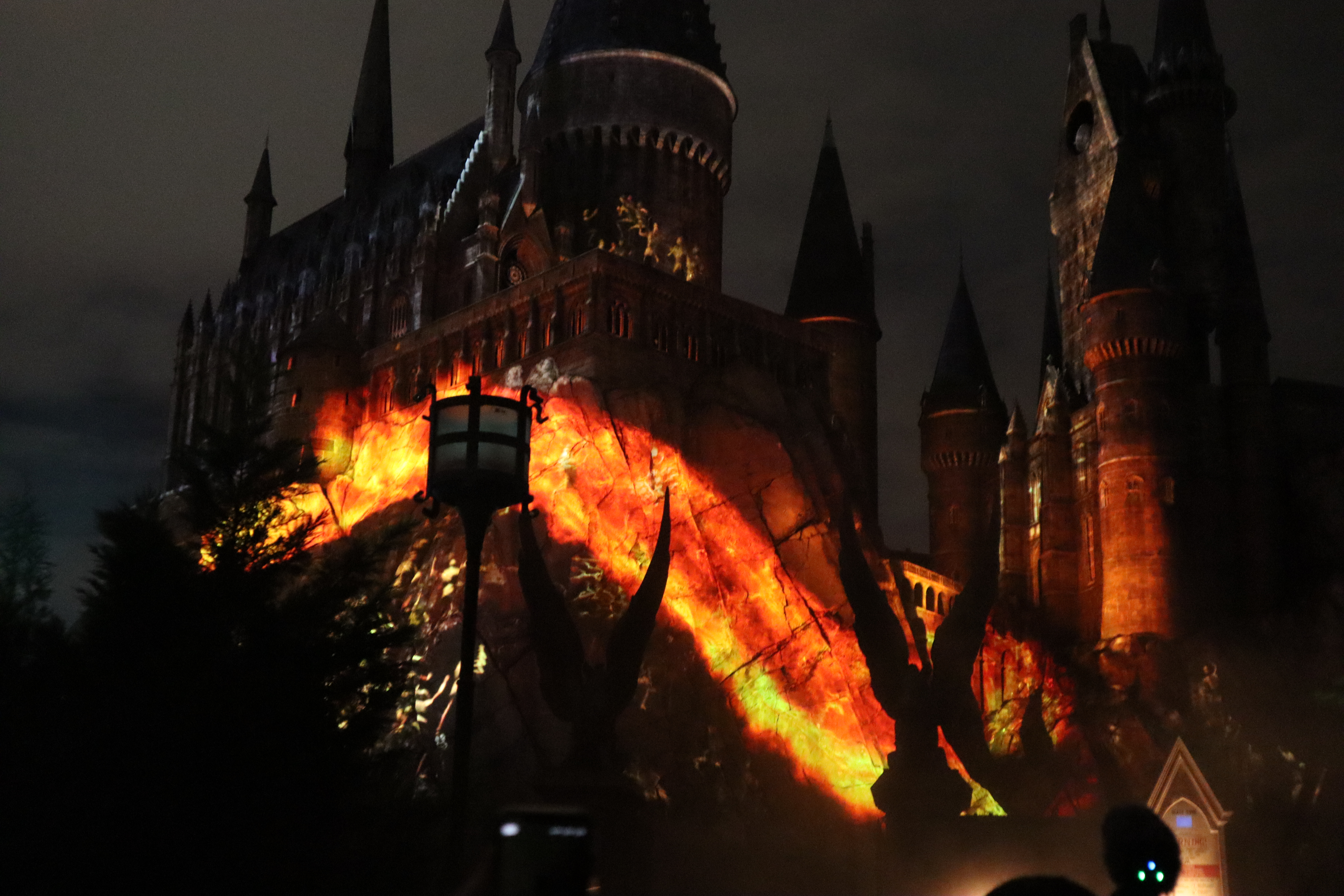 The projection show is approximately ten minutes of breathtaking visual effects accompanied by pyrotechnics and hauntingly beautiful music from the movies. The show features the most mysterious of all magic, the Dark Arts. The lights dimmed, and Parseltongue was whispered across all the speakers around us. Attendees stood frozen to the spot. The show started, and each scene was more frightening and enrapturing than the next. It began with the castle transforming to the dark storefront of Borgin and Burkes and featuring the creepy stacked skulls. Hagrid would be pleased, and possibly even a little concerned, to see the Acromantulas crawling up the castle walls (this part even featured what looked to be a human body “snack” for the spiders). We were definitely not prepared for the fiery waves of Inferi to overtake the castle right before Voldemort himself took the scene and the walls of Hogwarts came “crashing” to the ground.
