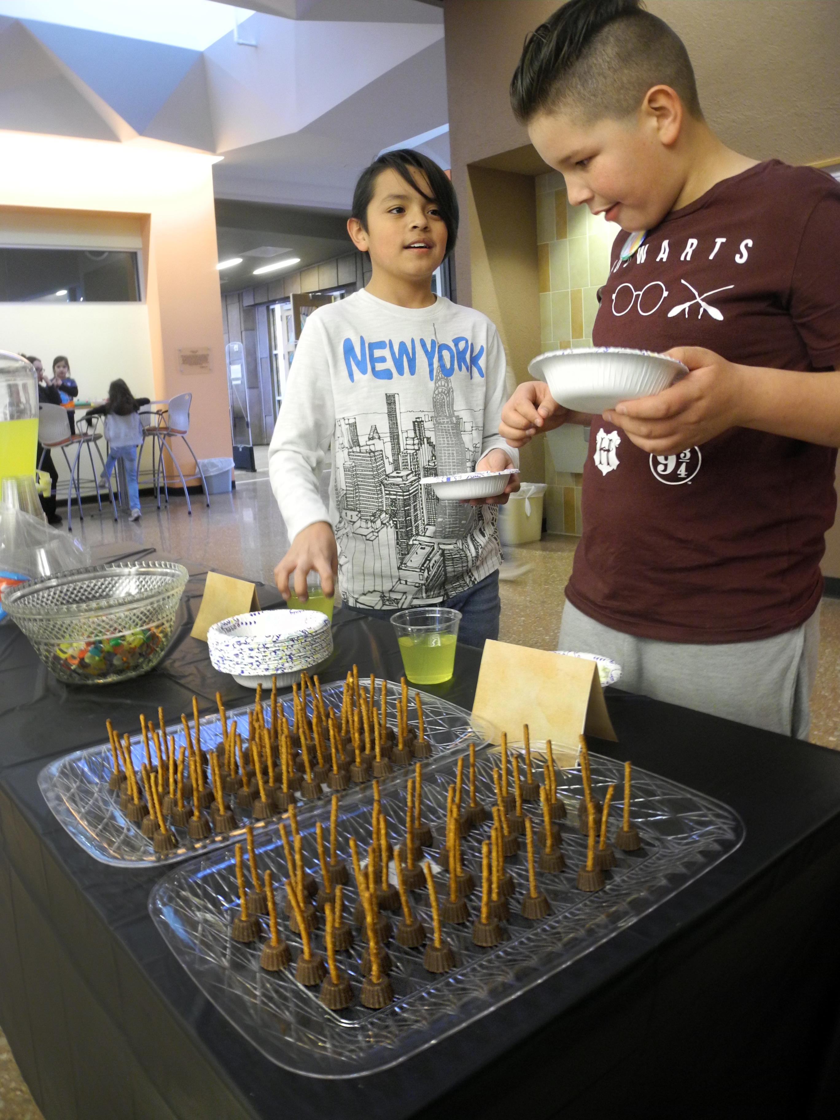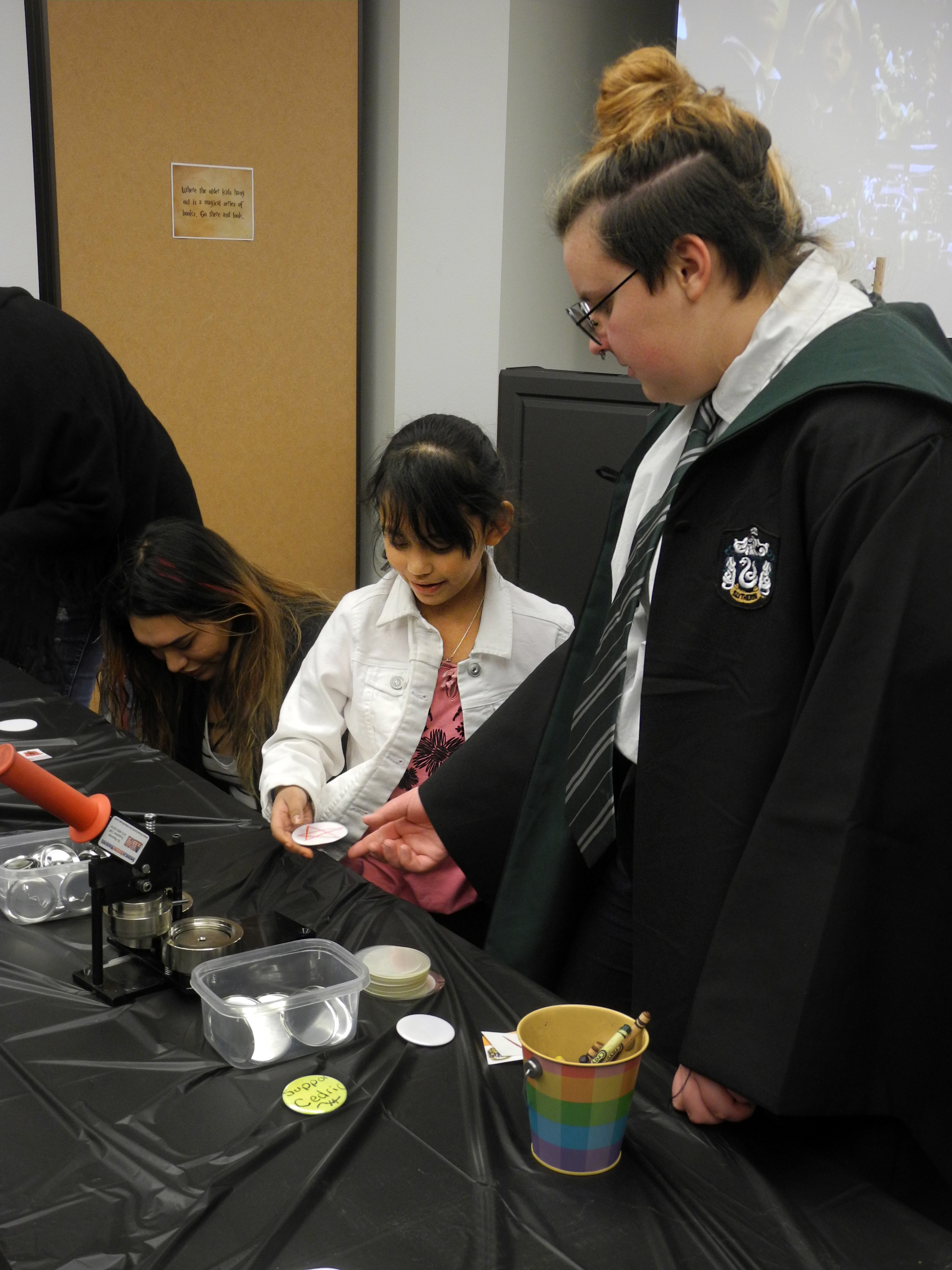 After assuming their new identities, kids were ushered to an obstacle course they navigated by broom, receiving a lightning-bolt scar tattoo as a prize. At the button-crafting table, they could create a badge declaring their support for their favorite champion or simply have their own custom design made into a memento. Completing a dragon craft earned participants a pair of Harry Potter glasses.
