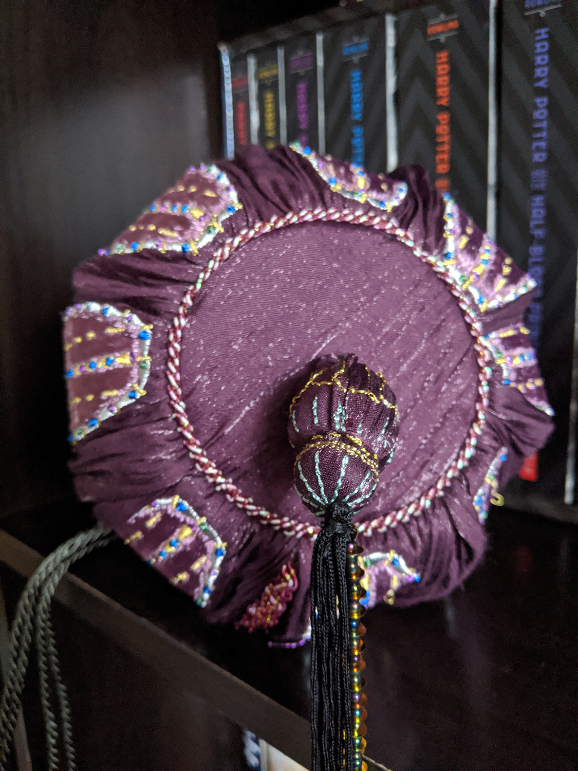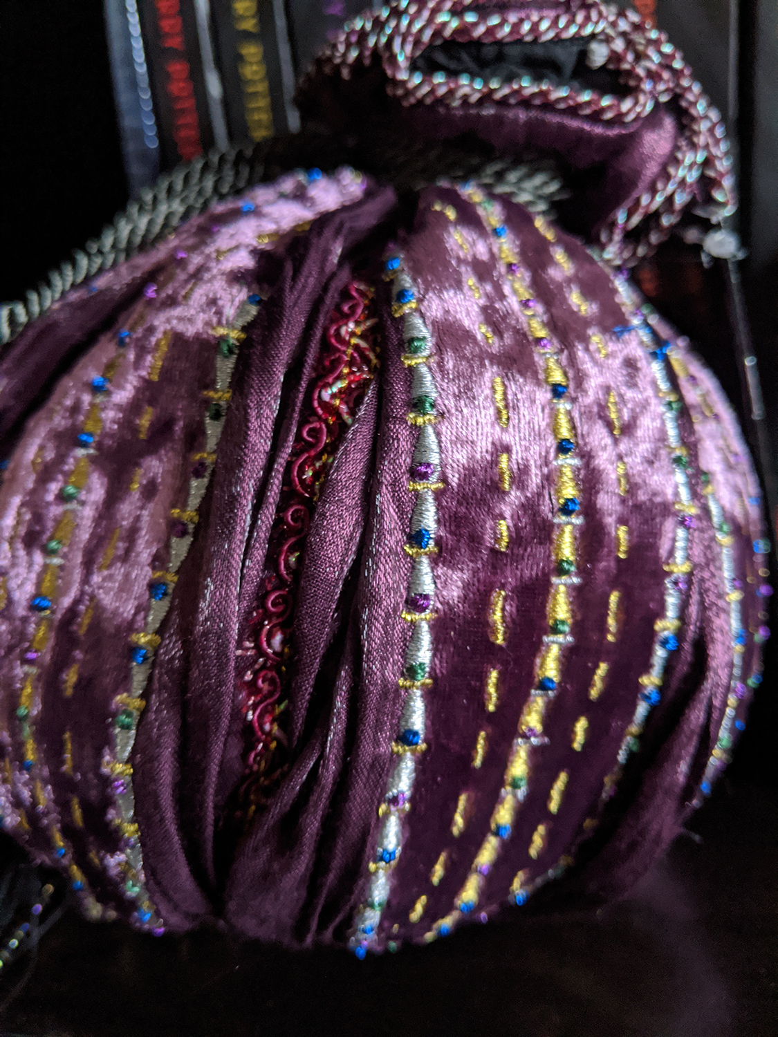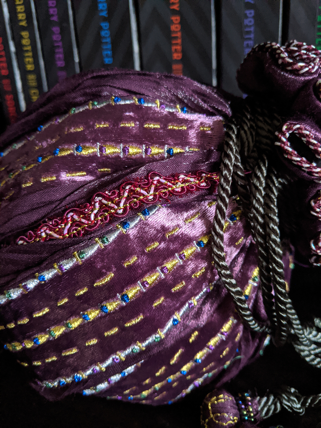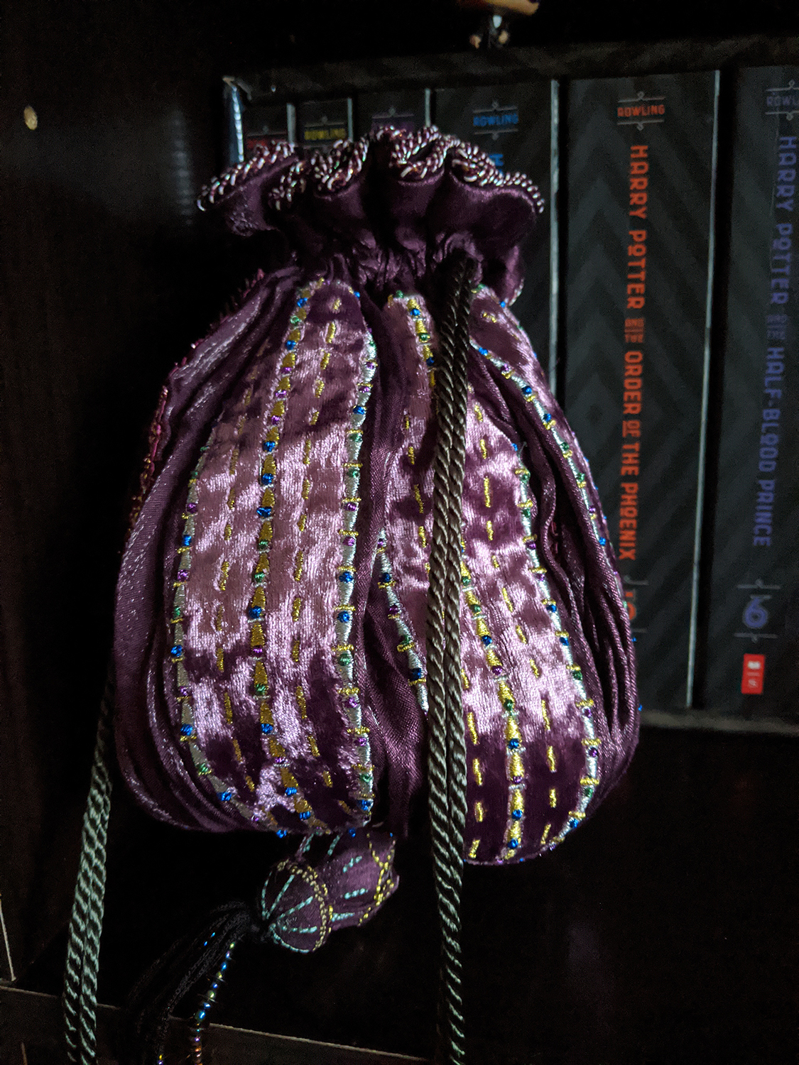 The main body is made up of alternating velvet and satin panels, embellished by metallic embroidery and strips of iridescent trimming ribbon. The drawstrings are actually much longer than I had anticipated – over two feet extended when the bag is cinched closed – and rather heavy, made of a silky, silvery rope and ending with beaded baubles. These nicely match the beaded tassel on the bottom of the bag, which is beautifully made and a lovely decorative touch, but it does prevent the bag from being able to sit upright on its base.