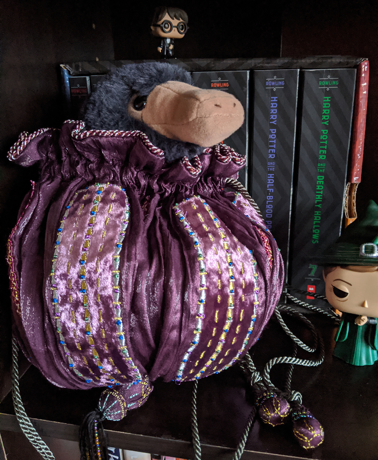 So what can fit inside? Even minus the Extension Charm, it can store a surprising amount. Its drawstring allows it to open almost completely flat, so oddly shaped objects aren’t much of a problem. I tried it and was surprised at how large it is when opened! I even managed to fit most of a plush Niffler inside (for reference, he’s about nine inches tall). After my experimentation, the bag was still perfectly fine and easy to plump back into shape to show off the paneling, thanks to the heavy materials used in its construction. It might not fit a whole tent or a library, but it could definitely serve as an elegant way to hold your essentials for a night out.
