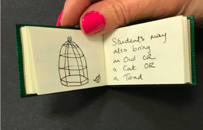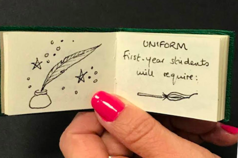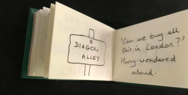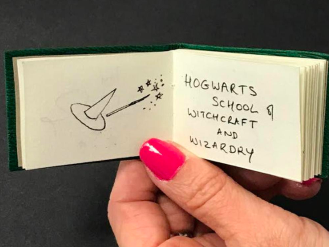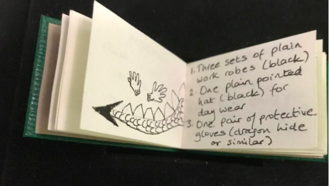In addition to the handwritten text, the tiny book contains doodles of broomsticks, quills, an owl cage, and a dragon’s tail.
