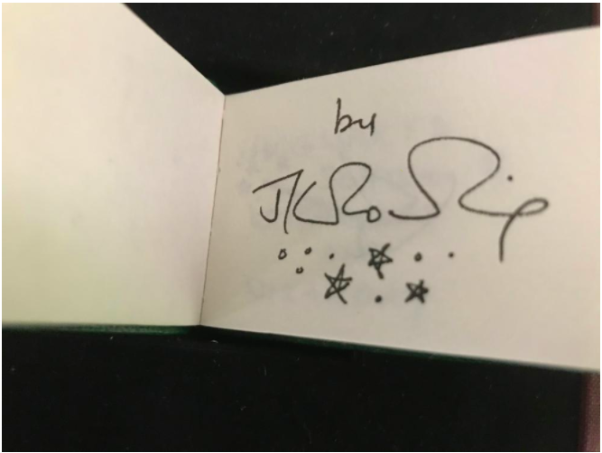 The first page features J.K. Rowling’s signatures, and the final page of the manuscript features the inscription “From: ‘Harry Potter and the Philosopher’s Stone’ by me.”