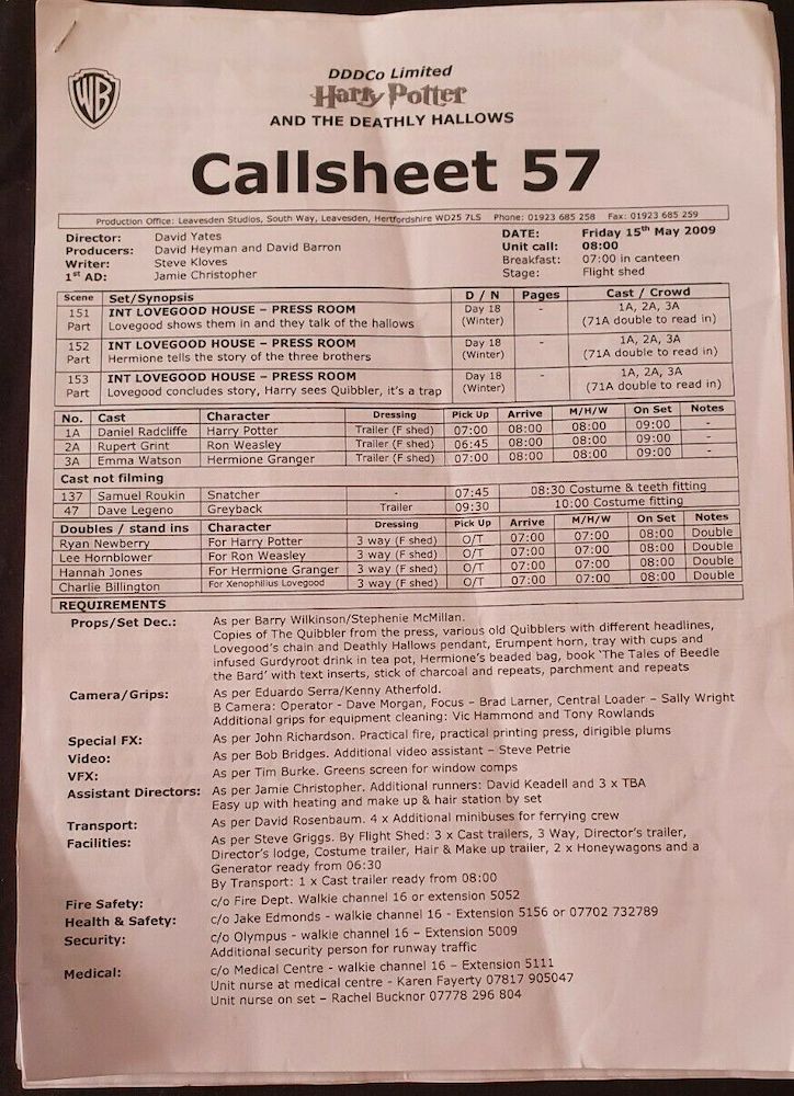 The call sheets are not the only items up for sale in aid of Mermaids. Daly-Smith is also auctioning a film trailer reel for Harry Potter and the Deathly Hallow – Part 1, a copy of The Tales of Beedle the Bard, Harry Potter: A Pop-Up Book by Insight Editions, and a movie companion book titled Harry Potter: Film Wizardry.