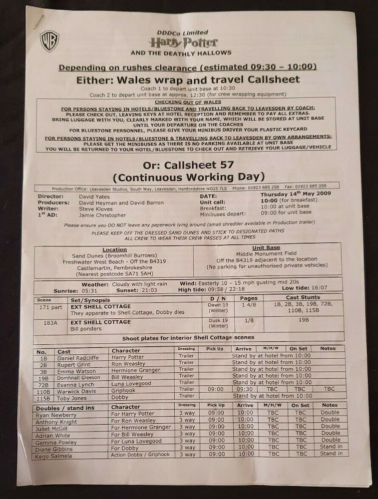 Daly-Smith revealed that she got her hands on these pieces of Potter history thanks to the acts of some kind security guards, who gave her the call sheets after she and a friend camped out at Freshwater West beach in Wales to watch the scenes being filmed.