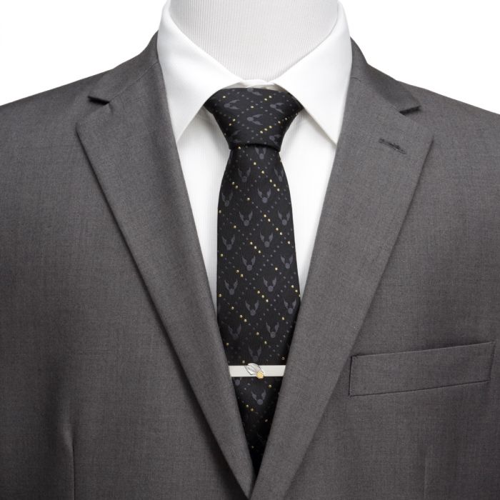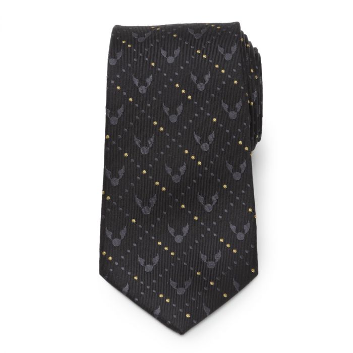 This stylish yet professional Golden Snitch black tie is exactly what you may be looking for to spice up the professional parts of your wardrobe. The tie is 100% silk and features diagonally crossing gold and black dots, with black stitched Snitches in each diamond made from the crossing dots. This means that when you are bored in a Zoom meeting or anywhere else, you have something to do: Count all the Snitches!