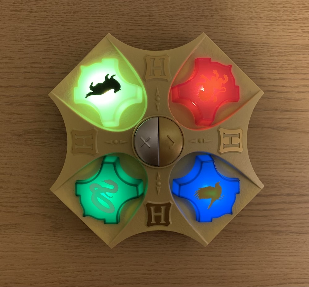 For the first round of questions, the Game Master decides which player will answer each question. This allows players to increase their point advantage by answering questions correctly using the gold and silver true/false buttons in the middle of the device. For the second round of questions, it’s every magical person for themselves, since only the fastest player can answer the question. In this round, players must press their House crest first before answering true or false. This is where the game really comes into its own, particularly if you are playing with competitive people! We really enjoyed the added element of speed to the regular trivia questions; it made for a really fun round with a lot at stake.