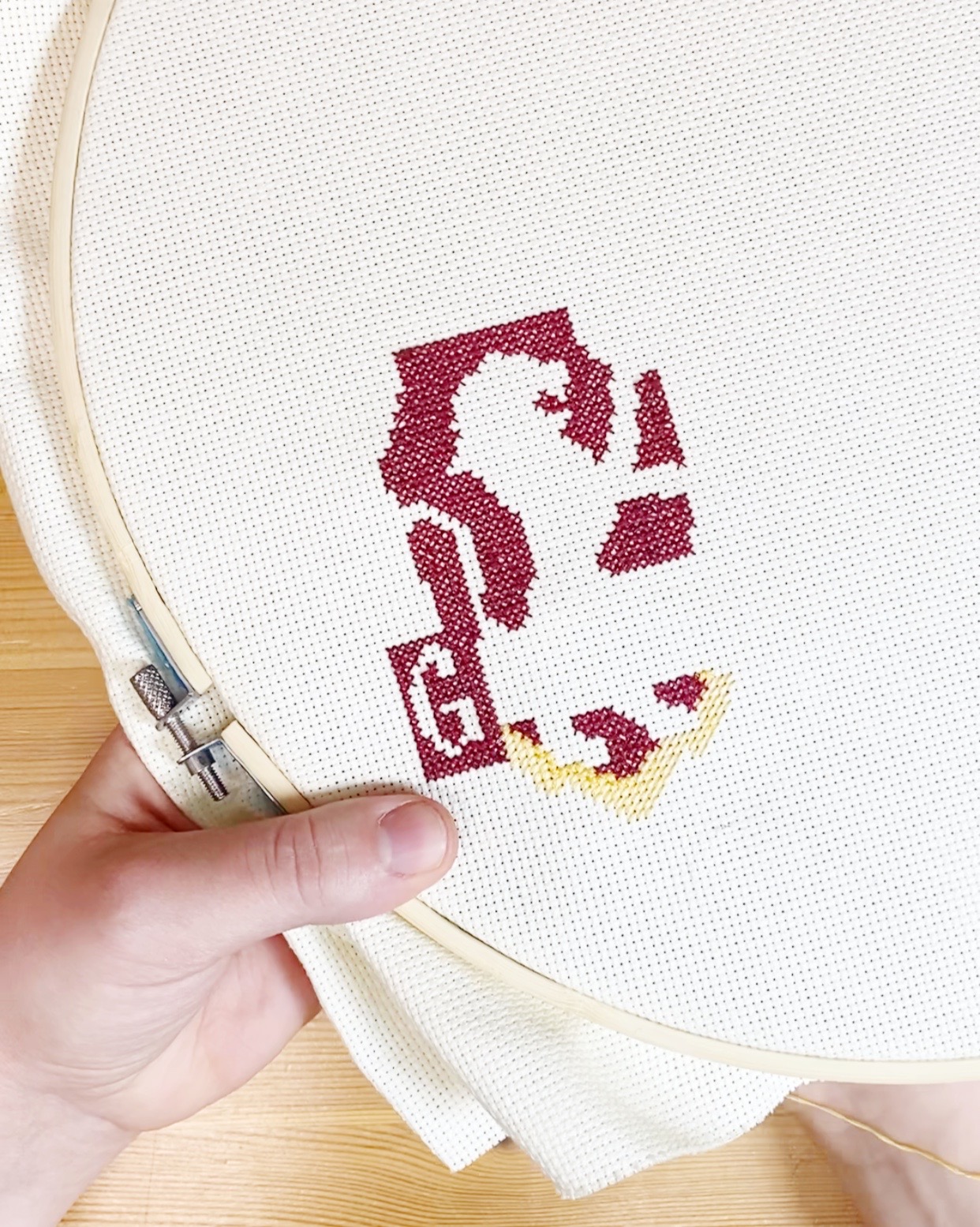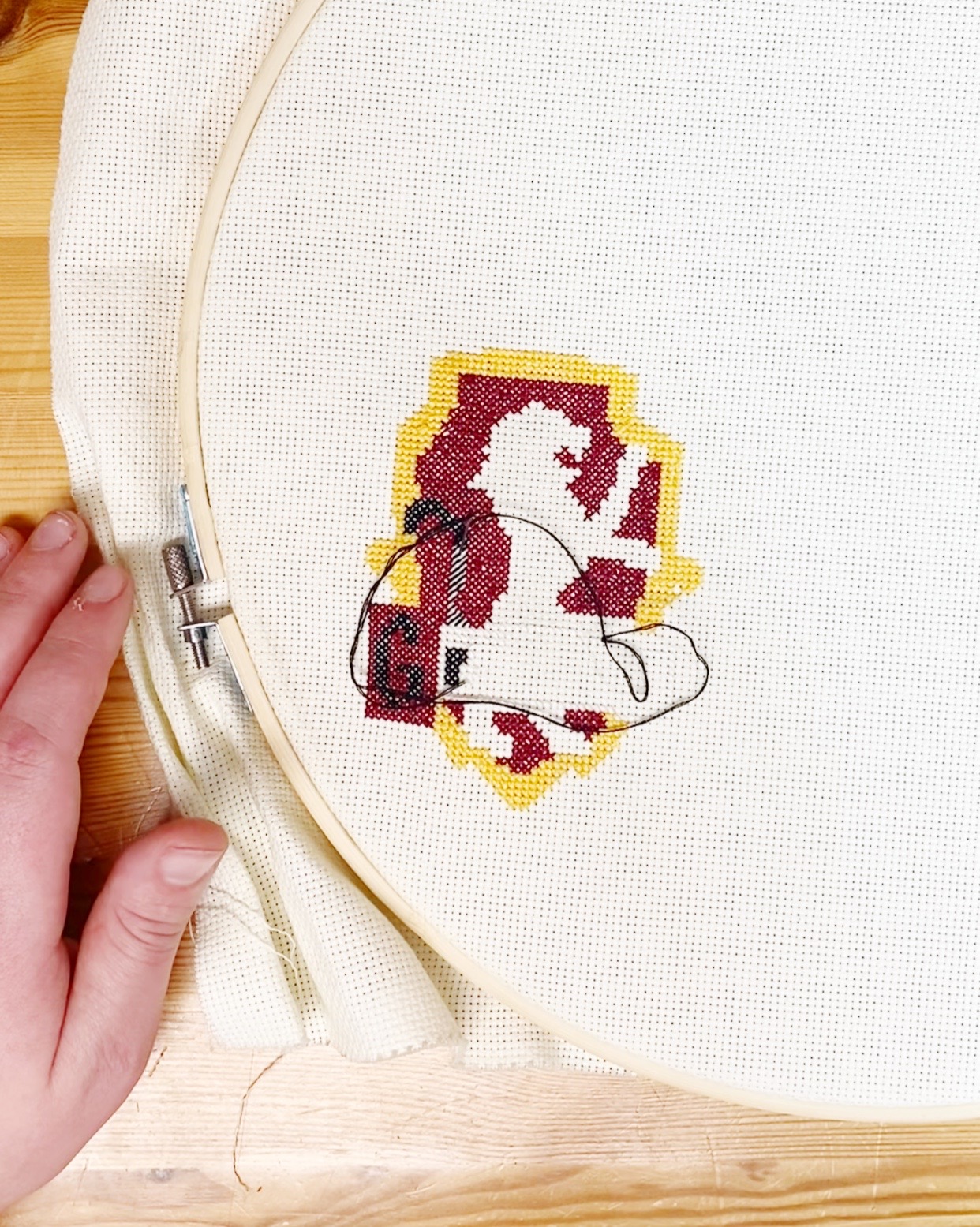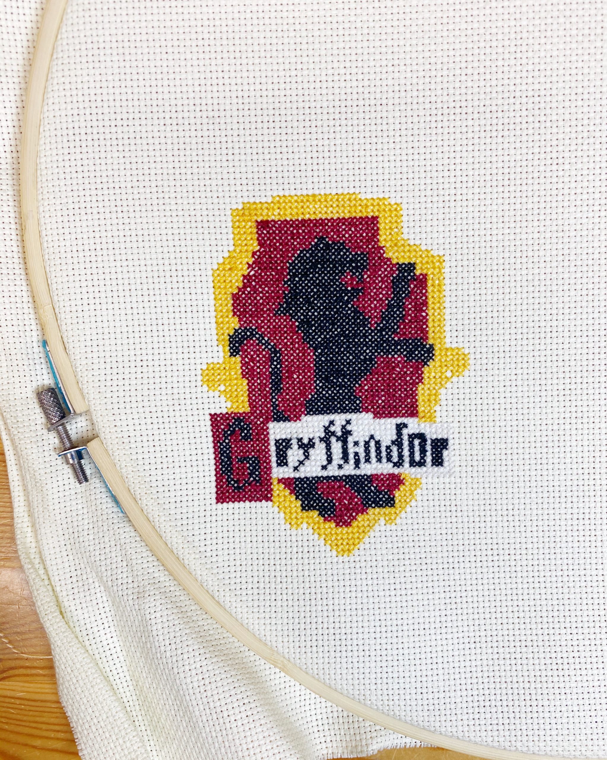 Step 2: Now that you have your pattern, it’s time to get stitching. Choose which color you’d like to start with and cut a length of 12-18 inches of embroidery floss. Separate two of the six thread strands from this section and thread them through your needle. Tie a knot in one end, and leave a tail on the other. Starting on the edge of your design (I started with the square around the G in Gryffindor) poke your needle up through the back of your fabric. Make a diagonal stitch to the next hole and pull it tight. Counting the stitches in your design, make a line of diagonal stitches, then work backward doing the opposite diagonal to form a row of X’s. When you get to the end of your thread or you’re switching colors, flip your hoop over and slide the needle underneath several other stitches, then snip the thread.