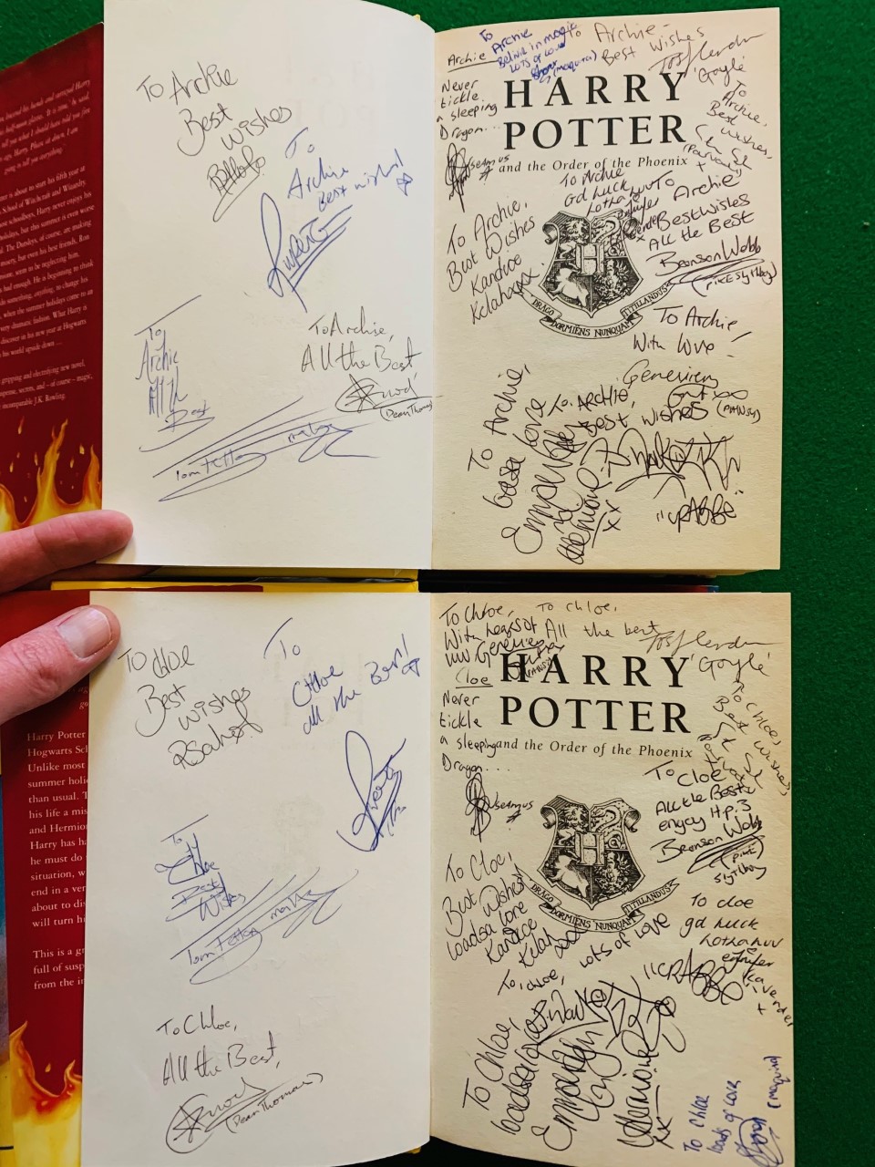 There are also two first editions of Order of the Phoenix signed by the cast of children from the film, including Daniel Radcliffe, Emma Watson and Rupert Grint. The vendor arranged for two books to be signed, one for each of her two children. Daniel Radcliffe has inscribed each one, 'Magic Rules OK!' and 'Magic Rocks!' Estimate £1,500-£2,500 each.