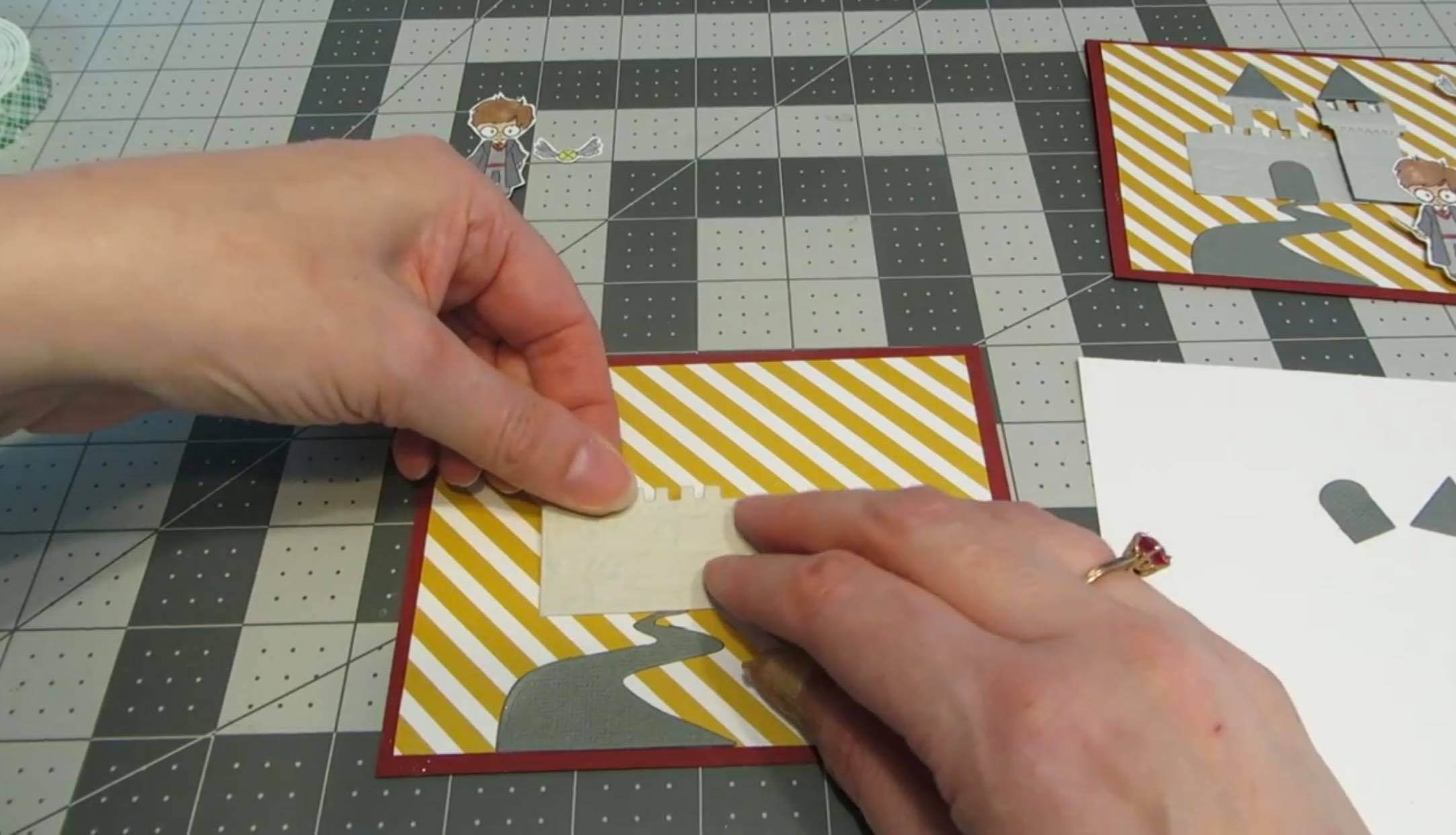 Step 8: On the back of the wizard, I added a couple of pieces of foam tape and a teeny little piece of foam tape for the middle of the Golden Snitch. Again, I overlapped him a little bit with the castle to give it a little bit of dimension.
