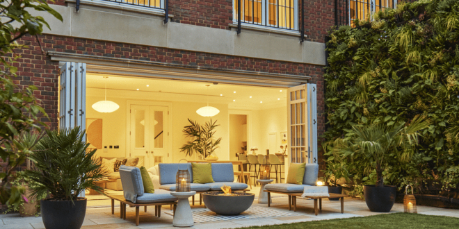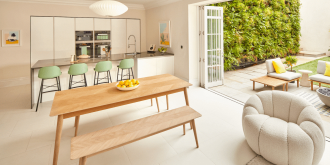 The house features numerous luxury finishes, including a spacious, modern kitchen and wide French doors that lead out onto a decked garden area that also provides a chance for alfresco dining. It has five bedrooms and two living areas, and it is decorated in light neutral tones, with modern art covering the walls.