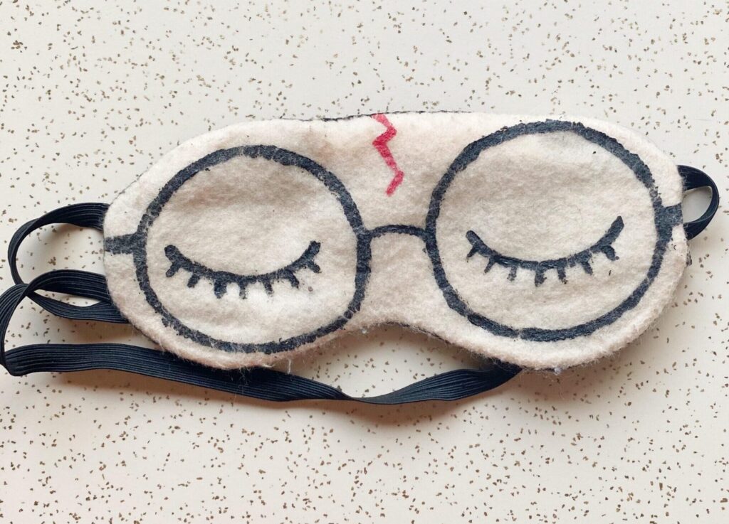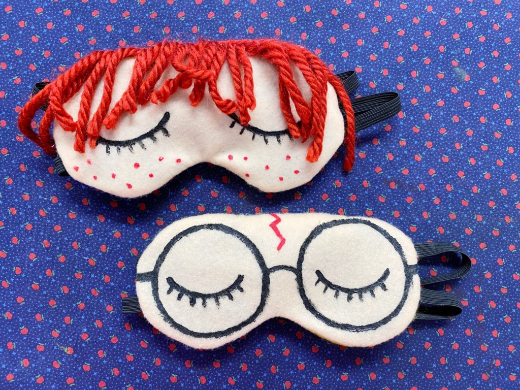 I can honestly say that I have not gone a single night without my sleep mask since I made these last year. So even with a ton of wear, I’m really pleased with how these have held up. You can see that the felt is getting a bit worn and my paint is not as crisp as it once was, but overall, these have held up great. Unfortunately, my Ron mask has gone MIA so I couldn’t picture it, but Harry is still going strong! I think that next time I would try doing the details (glasses, scar, etc.) as felt appliques rather than paint just to keep them looking a bit crisper, but that’s me being nitpicky.