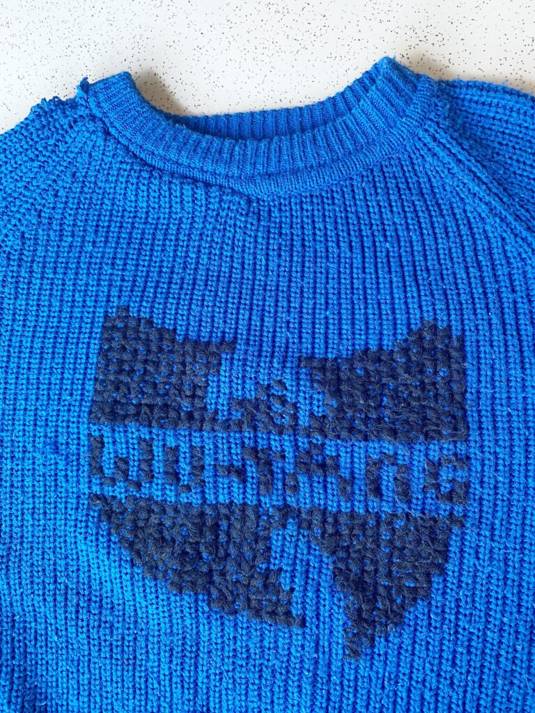 Full disclosure – I have not worn my Weasley jumper very much. This doesn’t have anything to do with how the cross-stitching held up; instead, it’s because of my choice of the sweater to cross-stitch on. It’s a bit big and made from really synthetic yarn, so I just don’t find it super comfortable to wear. The stitching is looking great, though, and this is a technique I have used many times before. Instead of a current picture of my Weasley jumper, here is a picture of another sweater I cross-stitched almost seven years ago and how it looks today. You can see that the yarn gets a bit fuzzy after wearing, but this is also a piece that has gone through the washing machine a few times. Generally, I would recommend spot-washing or handwashing your Weasley jumper to keep this from happening, but even so, I think it’s held up really well.
