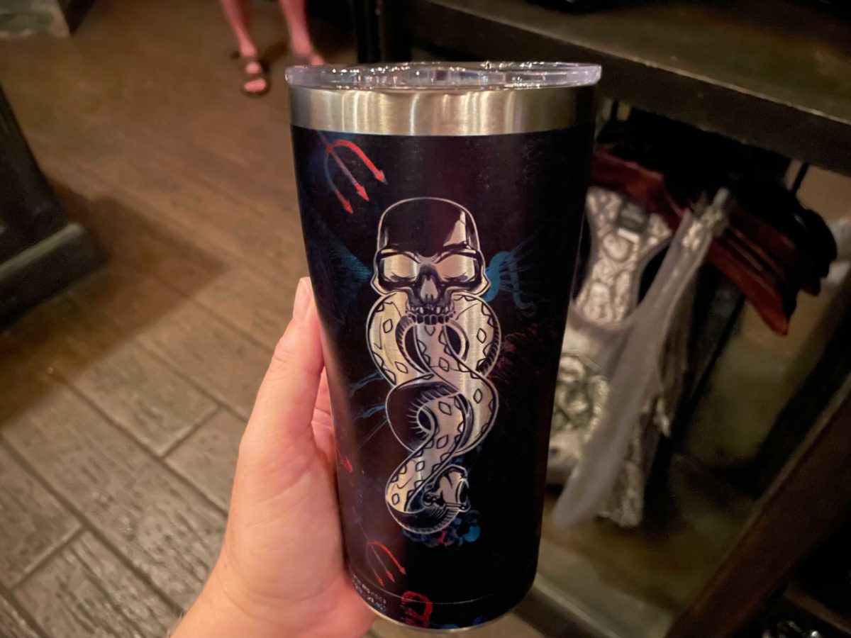 There’s also a new way to enjoy your morning brew: a Polyjuice Potion mug! The mug is shaped like a cauldron, and the aged label on the front makes sure everyone knows that it once was a part of Horace Slughorn’s own personal apothecarium. Once you’ve had your morning coffee, you can pack your lunch in the new Hogwarts House lunch boxes. Each House has its own bag, featuring the House crest, colors, and traits. They all retail for $35. If you want a drink to take with you, you could always show your support for Voldemort with a Dark Mark Tervis tumbler. In addition to a huge silver Dark Mark on the front, the mug features a small nod to each House in the form of their animals. Both mugs can be found in Borgin and Burkes, while the lunch boxes will be spotted at CityWalk.