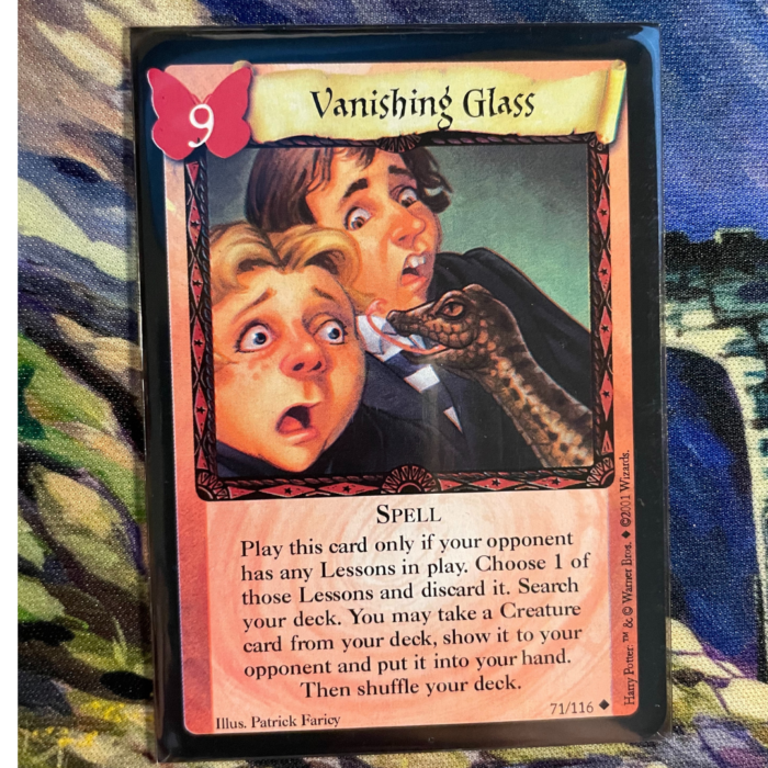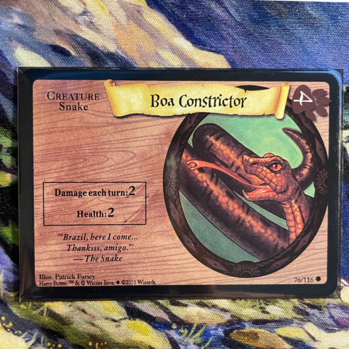 Throughout the game, you can see the descriptions of images from the books are widely respected and stay as true as can be. Harry’s description, as well as Dudley’s and his best friend Piers Polkiss’s, can be seen in Harry Hunting, card number 23/116. Dudley takes up half the image, and Piers, a “scrawny boy with a face like a rat,” and Harry are drawn to bring their images to life (SS 23). Chapter 2, “The Vanishing Glass,” states that Piers is “usually the one who held peoples arms behind their backs while Dudley hit them” (SS 23). In this card, we can see the details of this full scenario taking place as Dudley is ready to strike, and Harry is tucked away, hiding from them both.