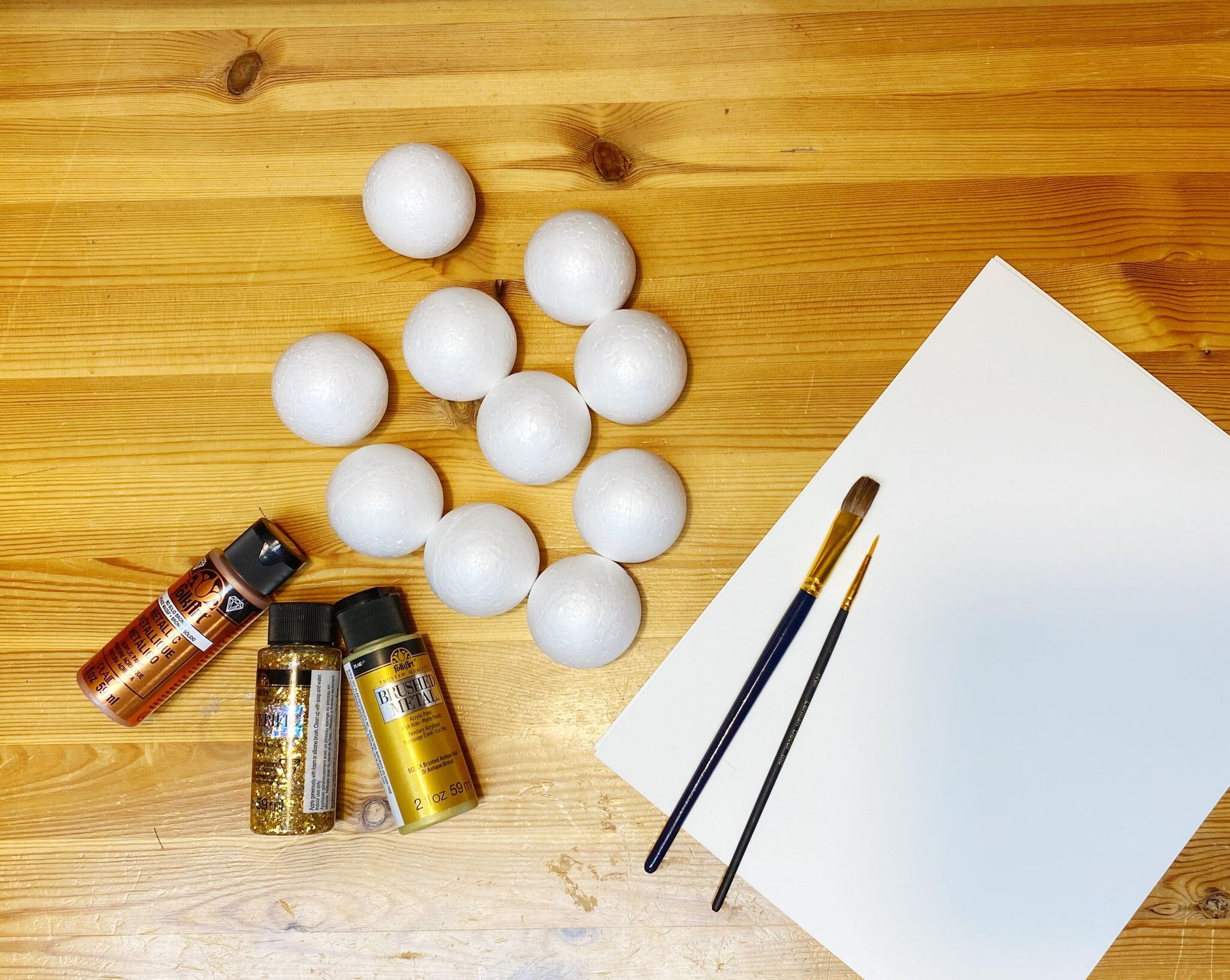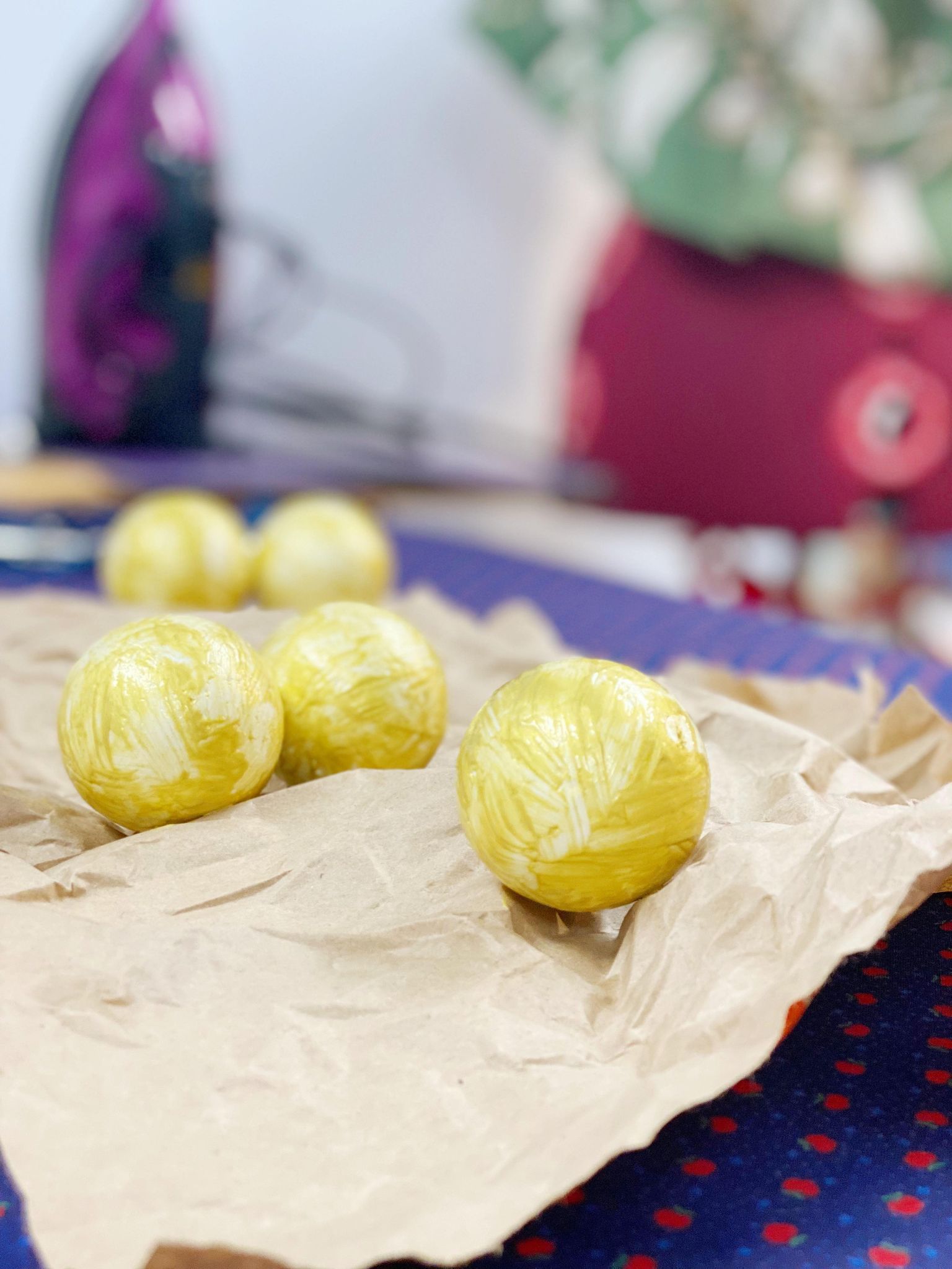 Step 1: First up, we’re going to paint the Snitches. Do a full coat of paint on all of your styrofoam spheres with gold paint and set them in an empty egg carton to dry. (I didn’t have one handy, so I used some crinkled craft paper, but it would have been much easier with a carton.) Don’t worry if it looks thin at first; it took me a couple of coats to build up enough paint. If you’re using spray paint, this will be easier and much faster. Allow your spheres to dry completely and then give them another coat, rotating so the spots where you held them aren’t left white. Allow them to fully dry.