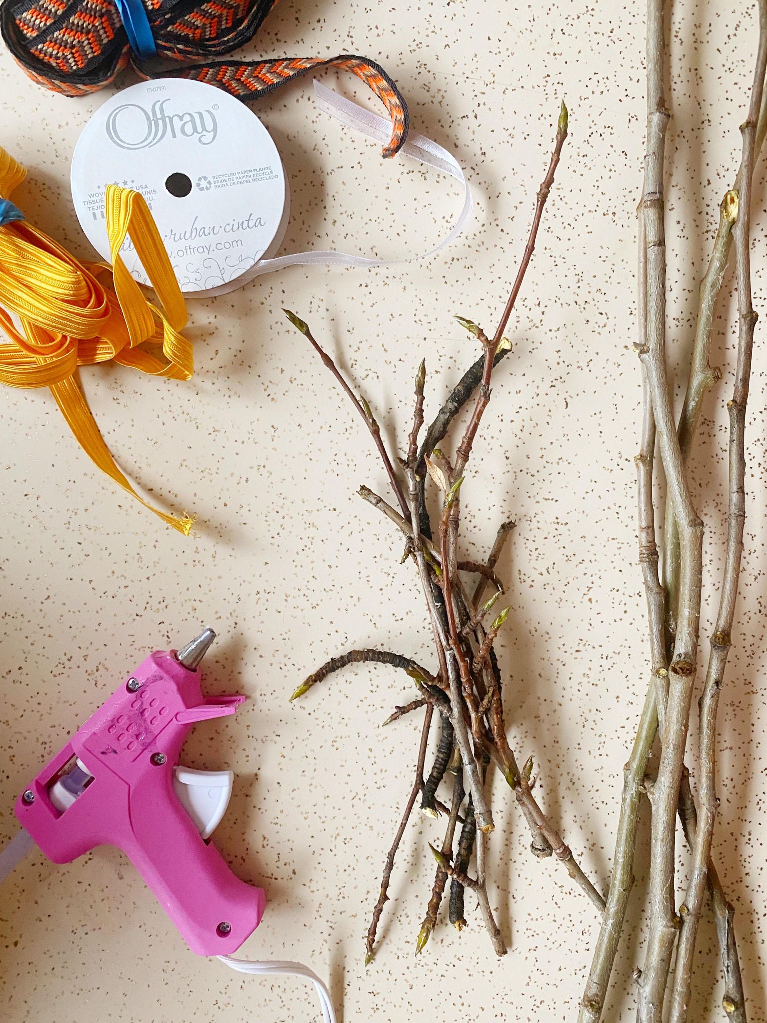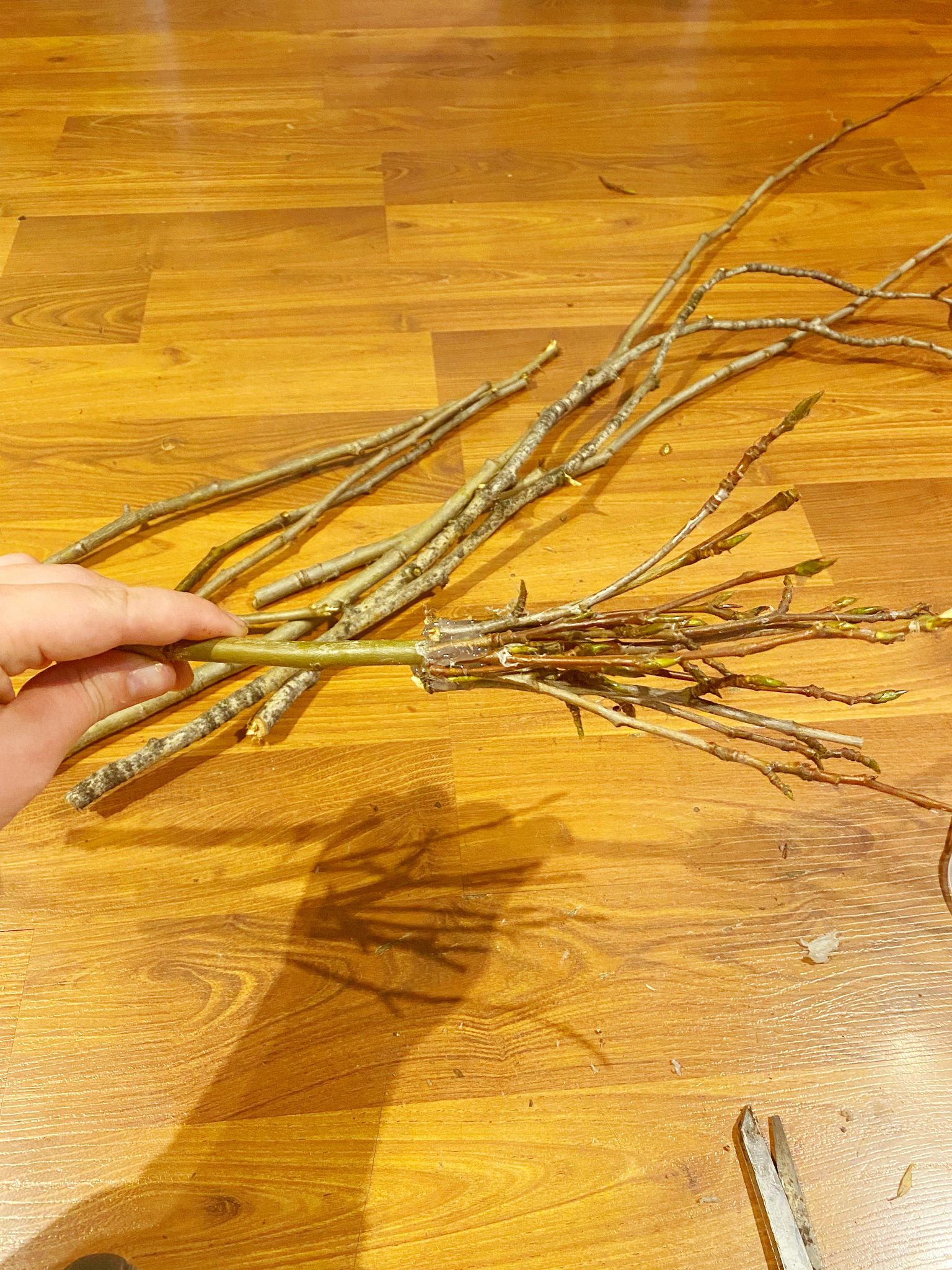 Cut your thinner twigs into lengths of 3-5 inches. Place a blob of hot glue on the broom handle near the end and press a twig into it. Once you’ve got one down, move around the handle gluing twigs next to each other. Once you’ve gone all the way around, you can start filling in any gaps left with different sized twigs or just do a whole second round until you get a fullness you’re happy with.