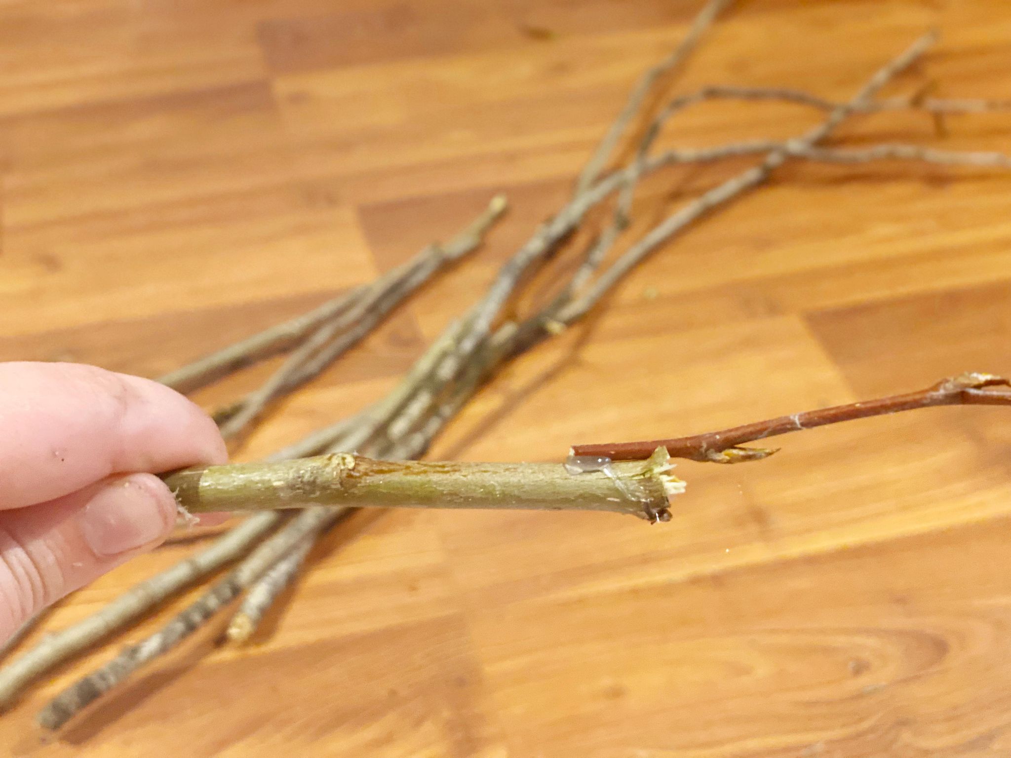 Step 4: Once your Snitches are done, you can start on the broomsticks. If you’re using craft sticks, this will be straightforward. If you’re foraging sticks, make sure they are completely dry before you start, or the glue won’t stick to the bark. Separate the thin pieces you want to use for the tail of the broom from the thicker sticks you’ll want to use for the handle and the Snitches. The broom handles should be a range of lengths from 12-18 inches long.