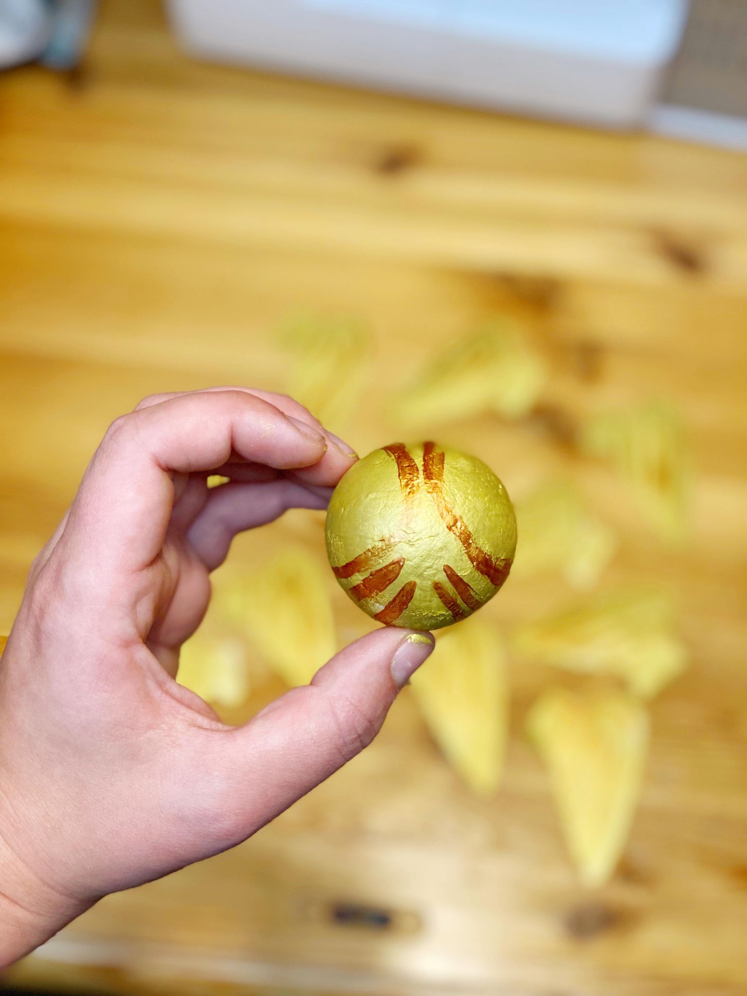 Once your Snitches are dry, take a thin paintbrush and paint on the details of the Snitch using bronze paint or a darker gold paint. I found it helpful to search for a reference image, but basically, this was two ovals with lines beneath them. Allow the bronze paint to fully dry. One coat was enough for me, but you could definitely do more if you wanted more solid lines.