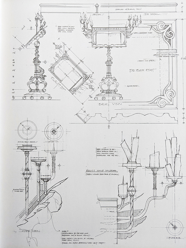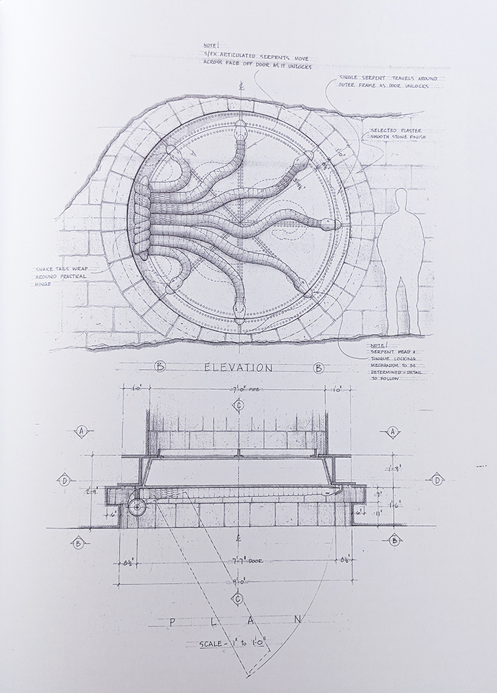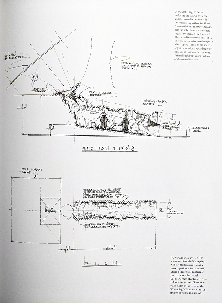 You can really see the care and the hours of work that went into each concept. The production crew explains how they designed sets not just to create an amazing visual, but also to account for every piece of production. The blueprints often display notes on planned camera movements and special effects that will interact with the set, such as the moving snakes on the door to the Chamber of Secrets or the golden owl that preens itself on Dumbledore’s lectern via CGI. There are even designs that drastically changed before making it into the film — for example, the narrow storeroom where Snape corners Harry about Polyjuice Potion in the fourth movie was originally a very spacious, octagonal room.