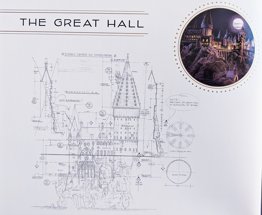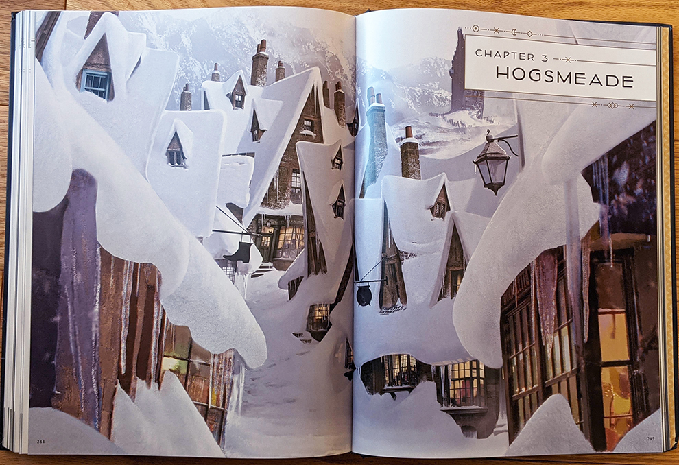 The book is divided into three enormous chapters: one focusing on Hogwarts Castle, one on the Hogwarts grounds, and the other on Hogsmeade. I was surprised that there wasn’t another for other locations — there’s nothing from Diagon Alley, the Ministry of Magic, Grimmauld Place, Malfoy Manor, the Burrow, or Privet Drive — but it’s only a minor complaint. I’m sure that would have doubled the size of the book, given the detail that’s displayed for every design.