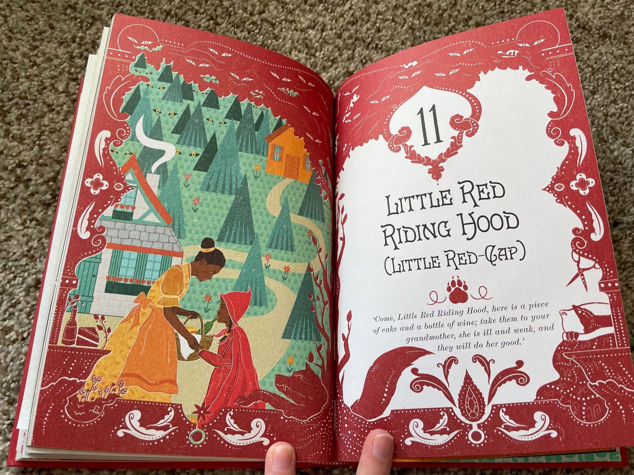All of the favorite classics from the German tradition are here: “Snow White,” “Sleeping Beauty,” “Cinderella,” “Hansel and Gretel,” and “Twelve Dancing Princesses” all make an appearance, as well as some lesser-known gems like “The Goose Girl,” “The Valiant Little Tailor,” and “Hans in Luck.” Each tale features a glorious, brightly colored title page with illustrations from various parts of the story represented. One of the best things about these illustrations is the diversity of the characters. For so long, there has been a narrow-minded view of Grimms’ stories — that due to their collection and publication in Germany, all the characters must be white European in appearance. MinaLima has entirely disregarded that notion and instead offers a variety of skin tones and cultural influences in their depictions. It truly serves to transform the stories and make the reader reassess them in a different way.