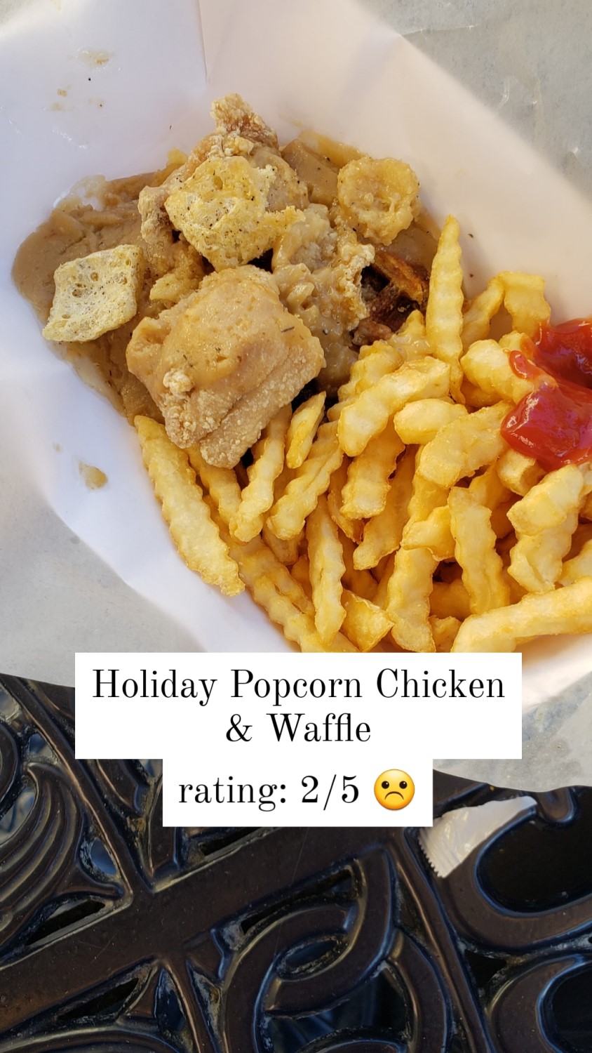 The holiday foodie options sound great, but try to sneak a peak at people’s plates before buying because food at Universal can be hit or miss. For lunch, at Mel’s Diner, we ended up getting three limited-time menu items. The first was the Holiday Popcorn Chicken & Waffle, and unfortunately, it was a bad choice. It’s supposed to be served with popcorn chicken, stuffing, gravy, cranberry sauce, and pork rinds on a waffle. The cranberry sauce was missing, the waffle was soggy from the gravy, and the side of fries was cold. The chicken was well flavored but was room temperature.