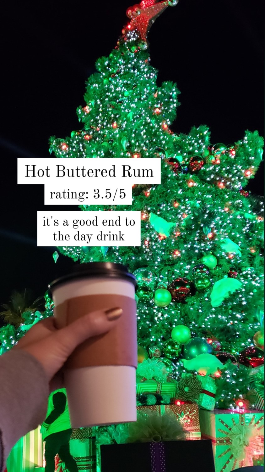 We ended the night with five more holiday food items. The alcoholic Hot Buttered Rum and the Peppermint Hot Chocolate are great treats for the nighttime. We snagged the last buttered rum offered in the Grinchmas Plaza around 6:40 p.m., so don’t wait too long to get one. Make sure to stir your drink with a utensil because the rum is added to the top.