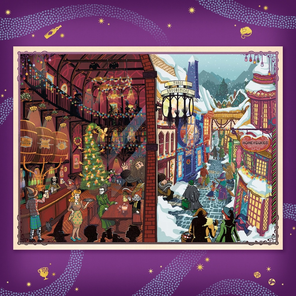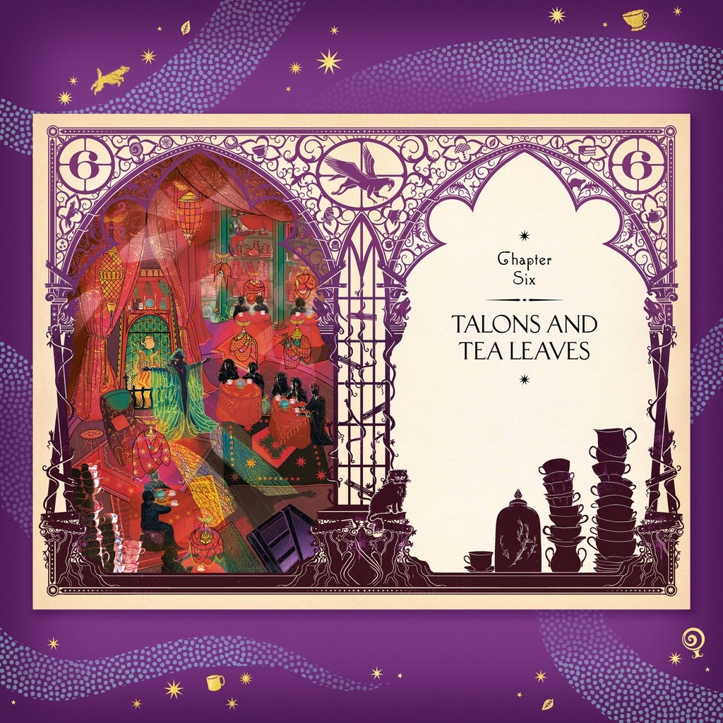 We’ve also been teased with a few inside spreads. The first shows Harry and other kids gathered admiringly around the Firebolt in Quality Quidditch Supplies in Diagon Alley. The second shows Trelawney’s Divination classroom at the start of Chapter 6, “Talons and Tea Leaves.” And the third shows professors inside the Three Broomsticks at Christmastime while shoppers stroll up Hogsmeade’s High Street.