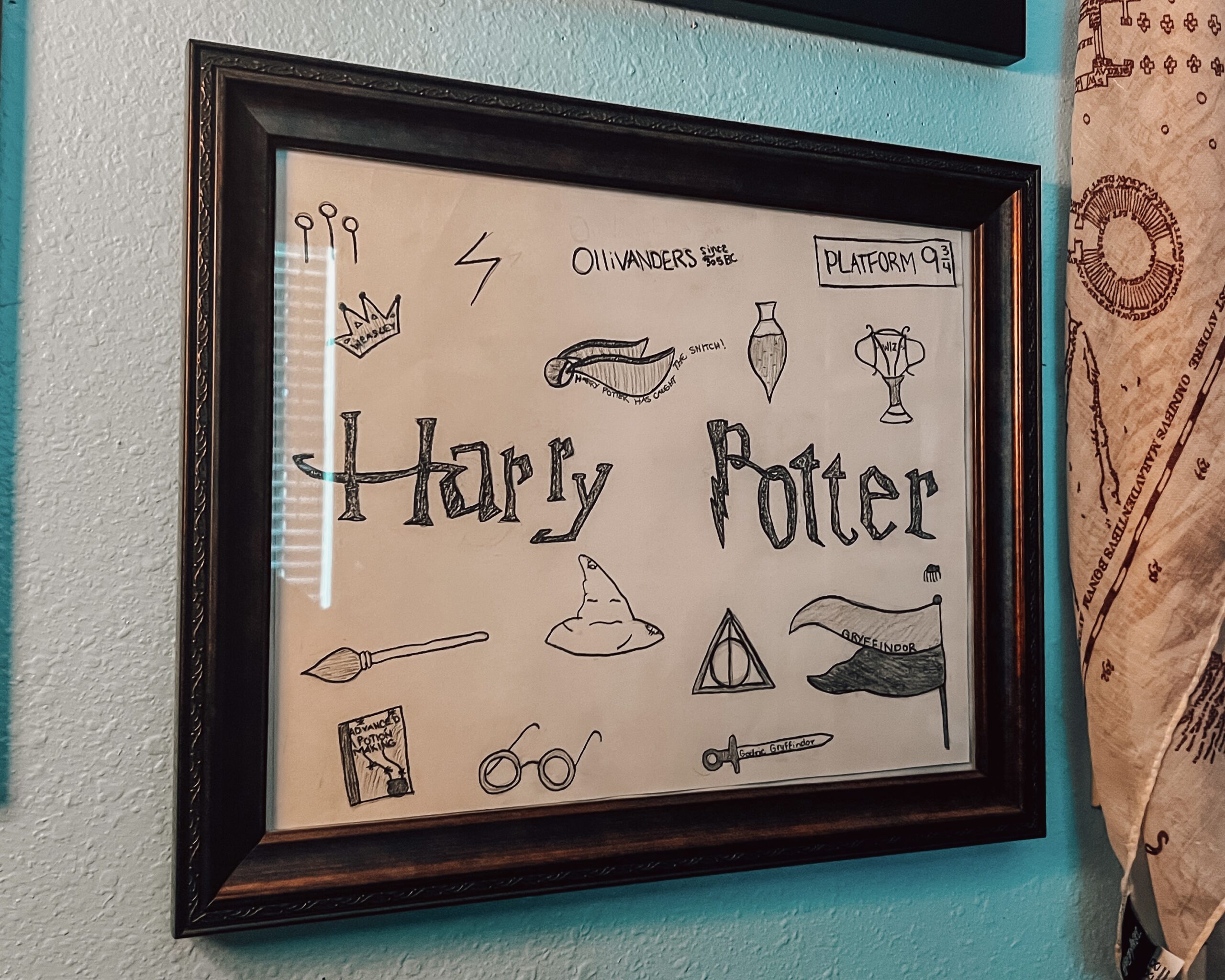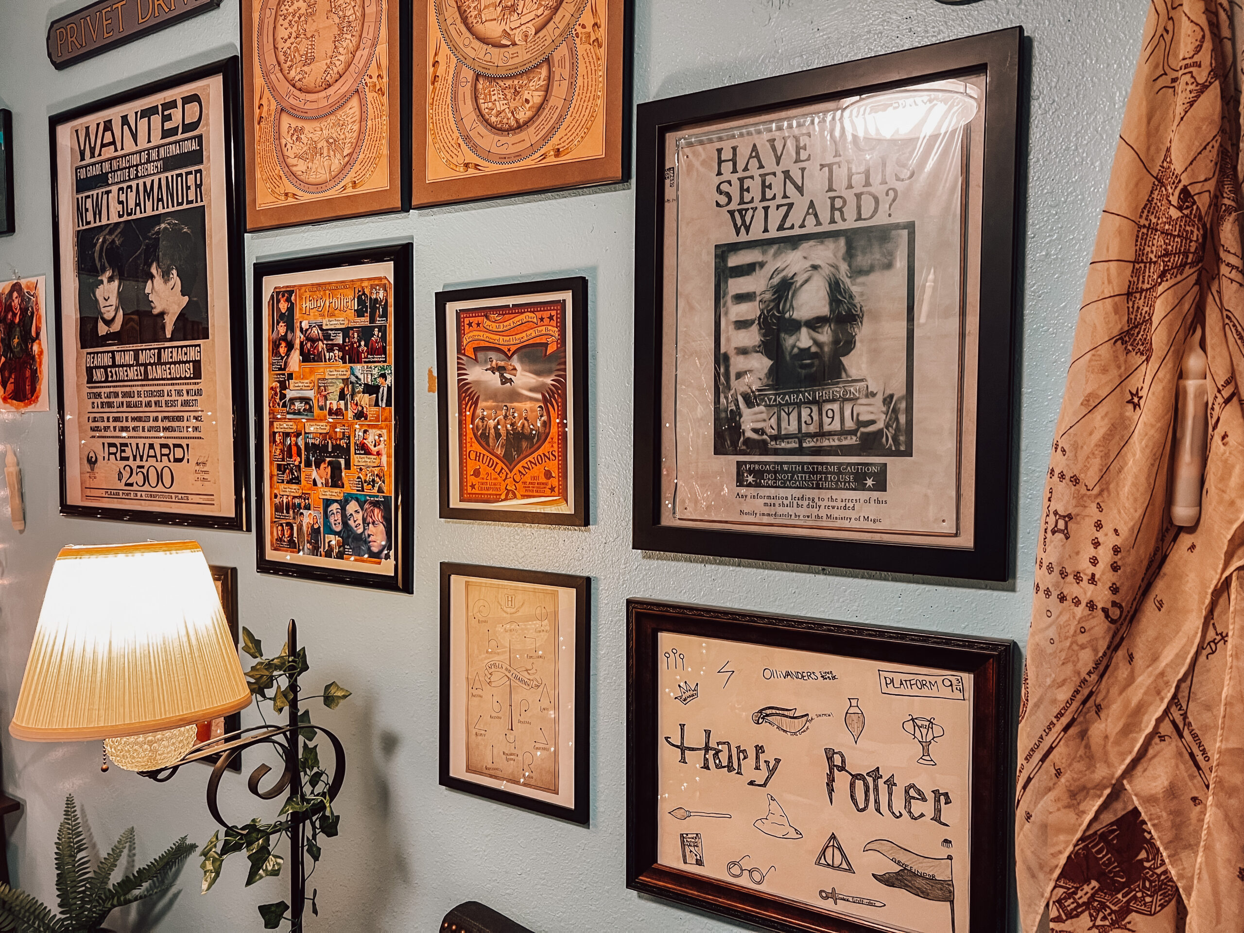 Ready to upgrade your room with a Harry Potter collage wall? We’ve got just the DIY for you. You can use your artwork, fan art, maps, posters, and souvenirs to make the perfect art wall worthy of the Hogwarts staircase walls. When creating this one, we used all of these and a few helpful tools to keep everything straight and even.