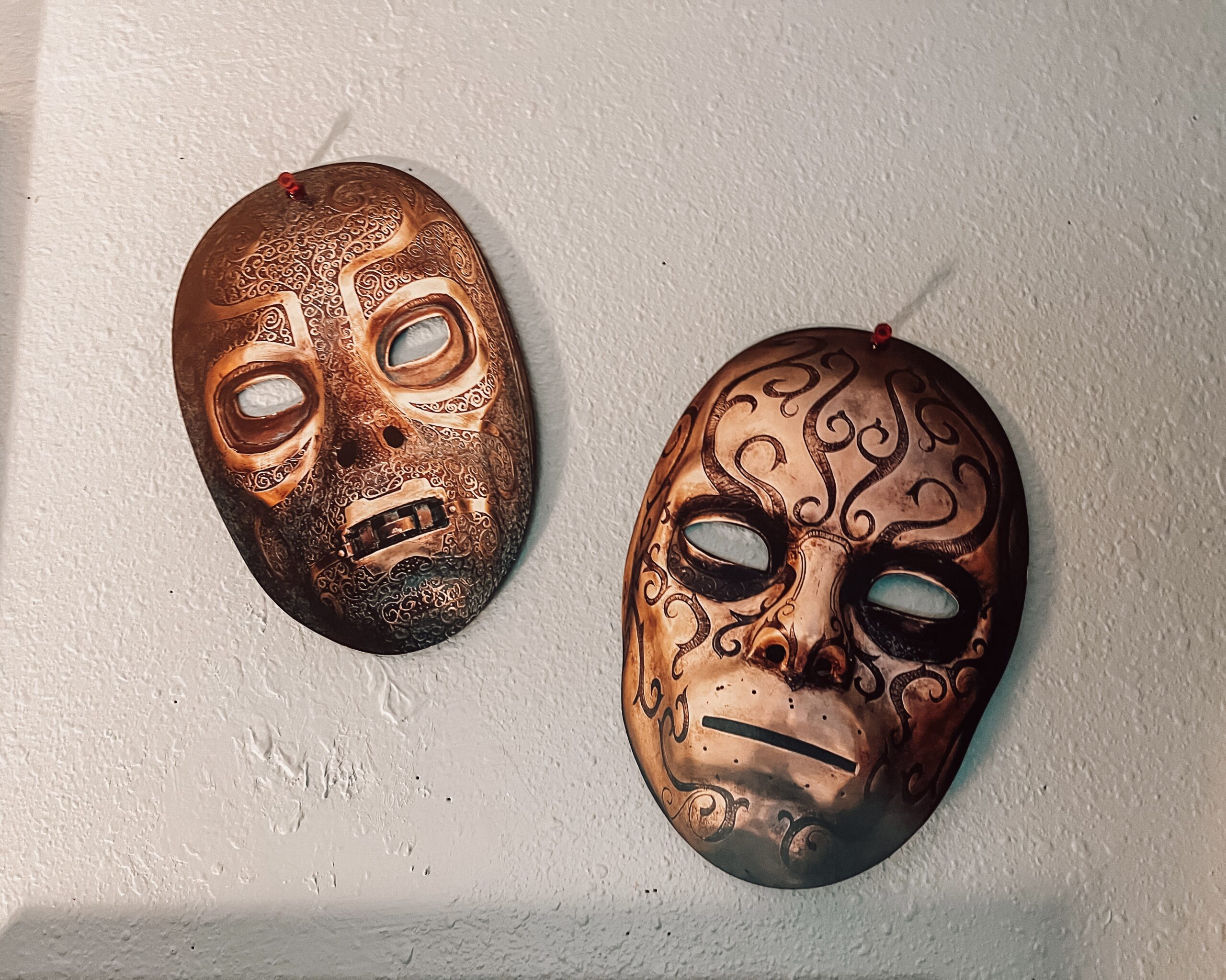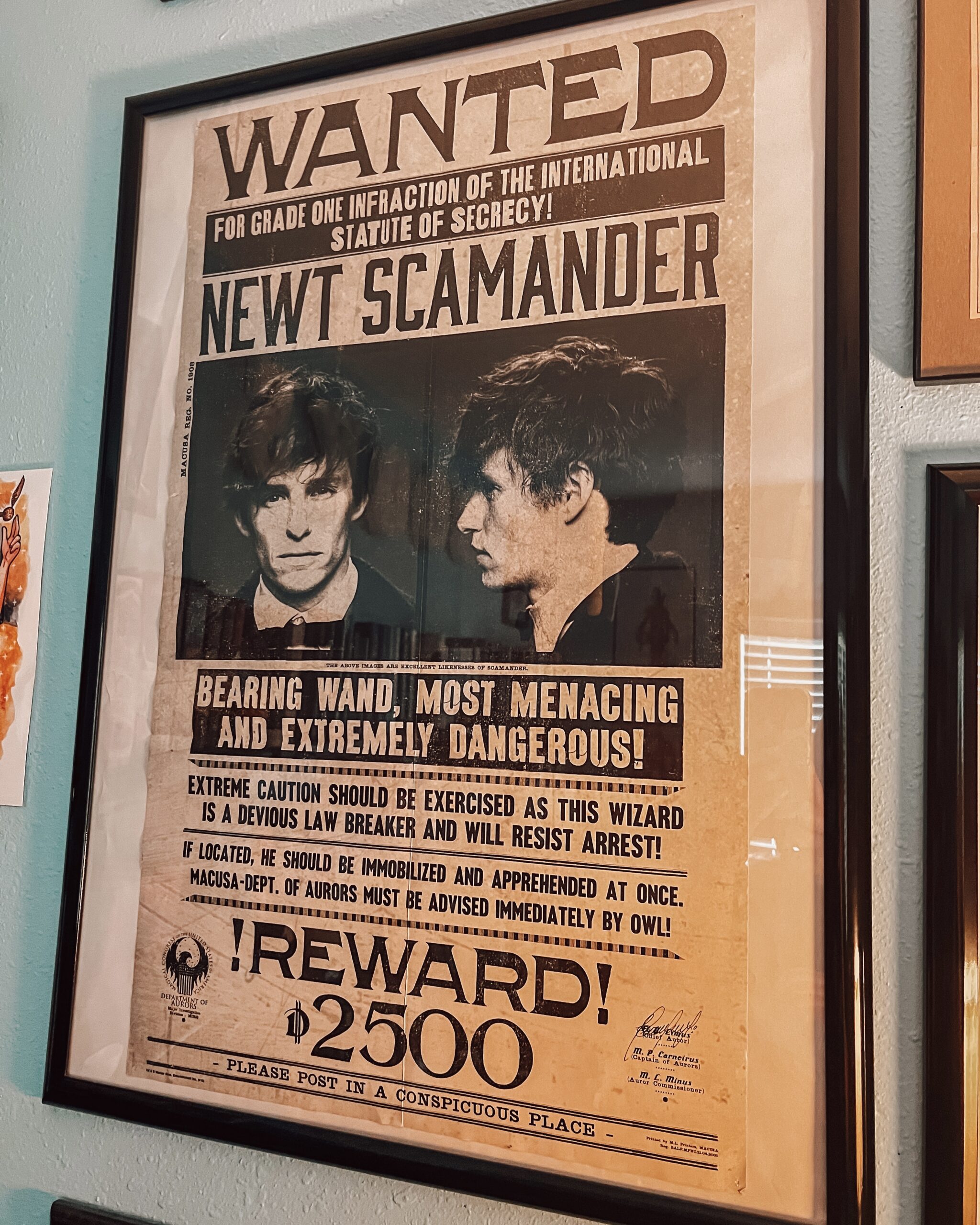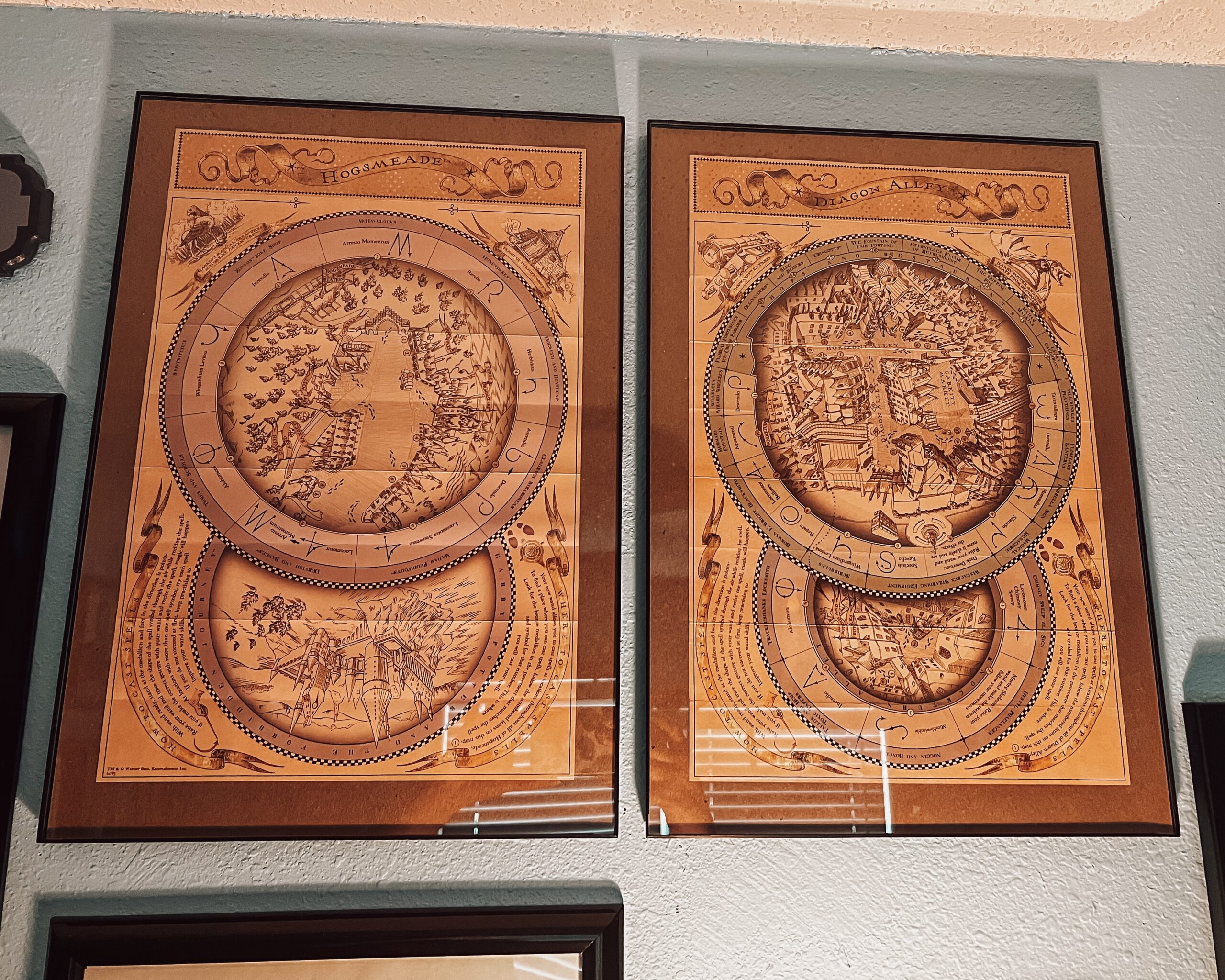 Step 1: Pick out the items you would like to hang. On this wall, we have posters, fan art, playbills from Harry Potter and the Cursed Child, maps from the Wizarding World of Harry Potter, some artwork, and items we have acquired from movie companion books and bookstores. From a Privet Drive sign to Death Eater masks to a Marauders scarf, this wall is unique to what we love about the Wizarding World, and your wall should be unique to you. Love fan art? Fill your wall with your favorite artists and characters. Love character posters? Frame them with pride. Choose the items you would love to display that will make you smile when you see them.