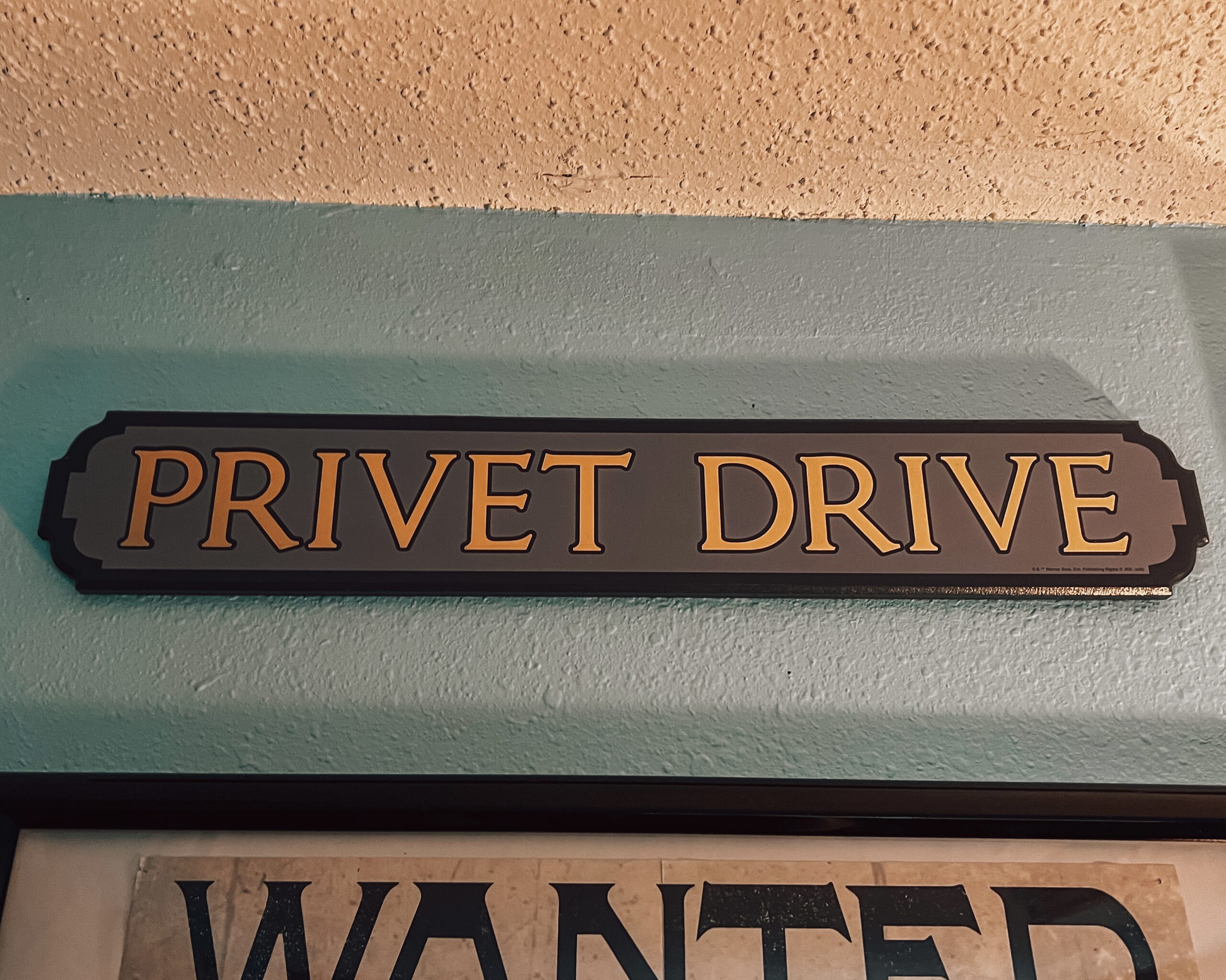 Step 5: Step back and look at your beautiful collage wall and make any last-minute adjustments you would like. We added some floating candles, masks, and a Privet Drive sign. Make the wall your own and admire the magical installation in your room.